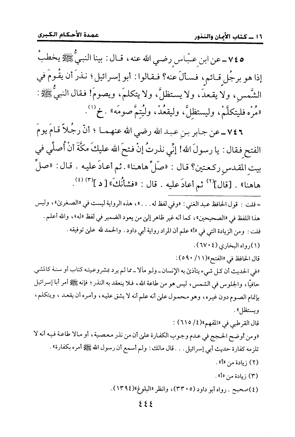 745 - عن ابنِ عبّاسٍ رضي الله عنه، قال: بينا النبيُّ - صلى الله عليه وسلم - يخطبُ إذا هو برجُل قائم، فسألَ عنه؟ فقالوا: أبو إسرائيل؛ نذرَ أن يقُومَ في الشَّمسِ، ولا يَقعدَ، ولا يستظلَّ، ولا يتكلمَ، ويصومَ! فقال النبيُّ - صلى الله عليه وسلم -: "مُرْه فليتكلَّم، وليستظِلَّ، وليقعُدْ، وليُتِمَّ صومَه".خ (¬1).