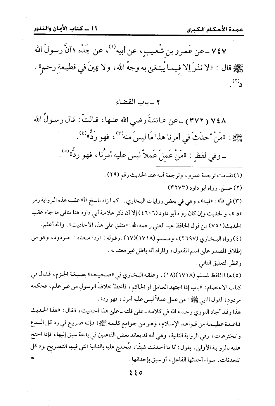 748) (372) - عن عائشةَ رضي الله عنها، قالت: قال رسولُ الله - صلى الله عليه وسلم -: "مَن أحدَثَ في أمرنا هذا مَا ليسَ منه (¬3)، فهو رَدٌّ" (¬4).