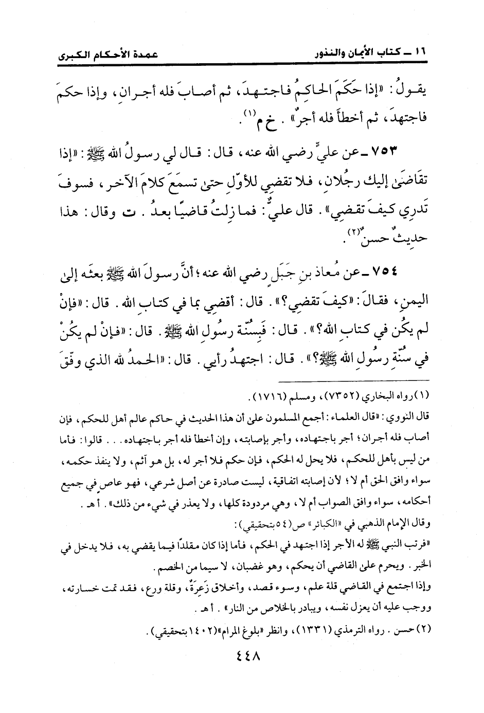 754 - عن مُعاذ بنِ جَبَلٍ رضي الله عنه؛ أنَّ رسولَ الله - صلى الله عليه وسلم - بعثَه إلى اليمنِ، فقالَ: "كيفَ تقضِي؟ ". قال: أقضِي بما في كتابِ الله. قال: "فإنْ لم يكُن في كتابِ الله؟ ". قال: فَبِسنّة رسُولِ الله - صلى الله عليه وسلم -. قال: "فإنْ لم يكُنْ في سنُّةِ رسولِ الله - صلى الله عليه وسلم -؟ ". قال: اجتهدُ رأيي. قال: "الحمد لله الذي وفّقَ