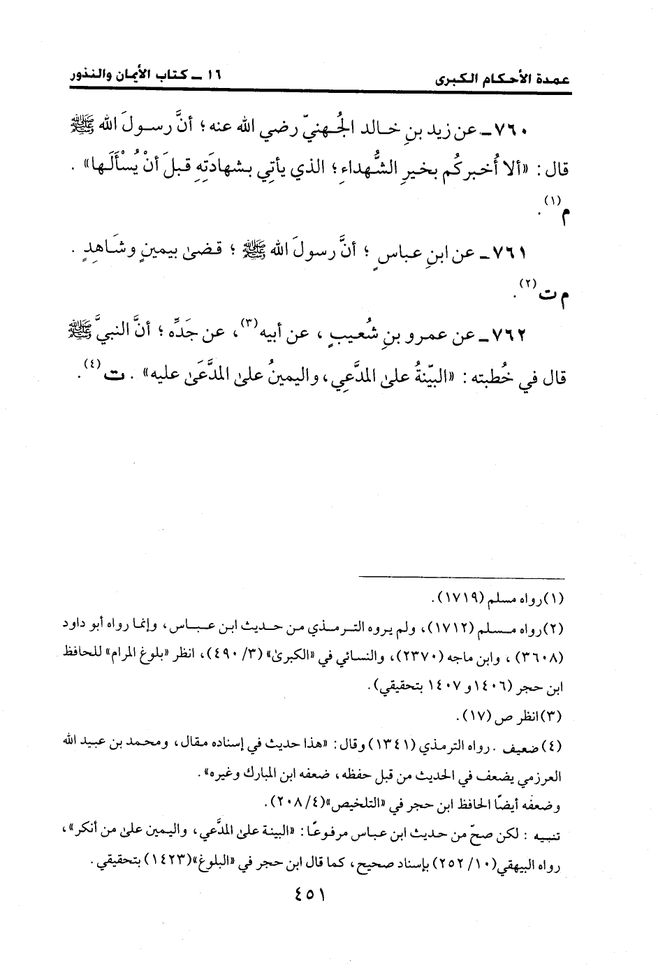 762 - عن عمرو بنِ شُعيبٍ، عن أبيه (¬3)، عن جَدِّه؛ أنَّ النبيَّ - صلى الله عليه وسلم - قال في خُطبته: "البيّنةُ علي المدَّعِي، واليمينُ علي المدَّعَى عليه". ت (¬4).