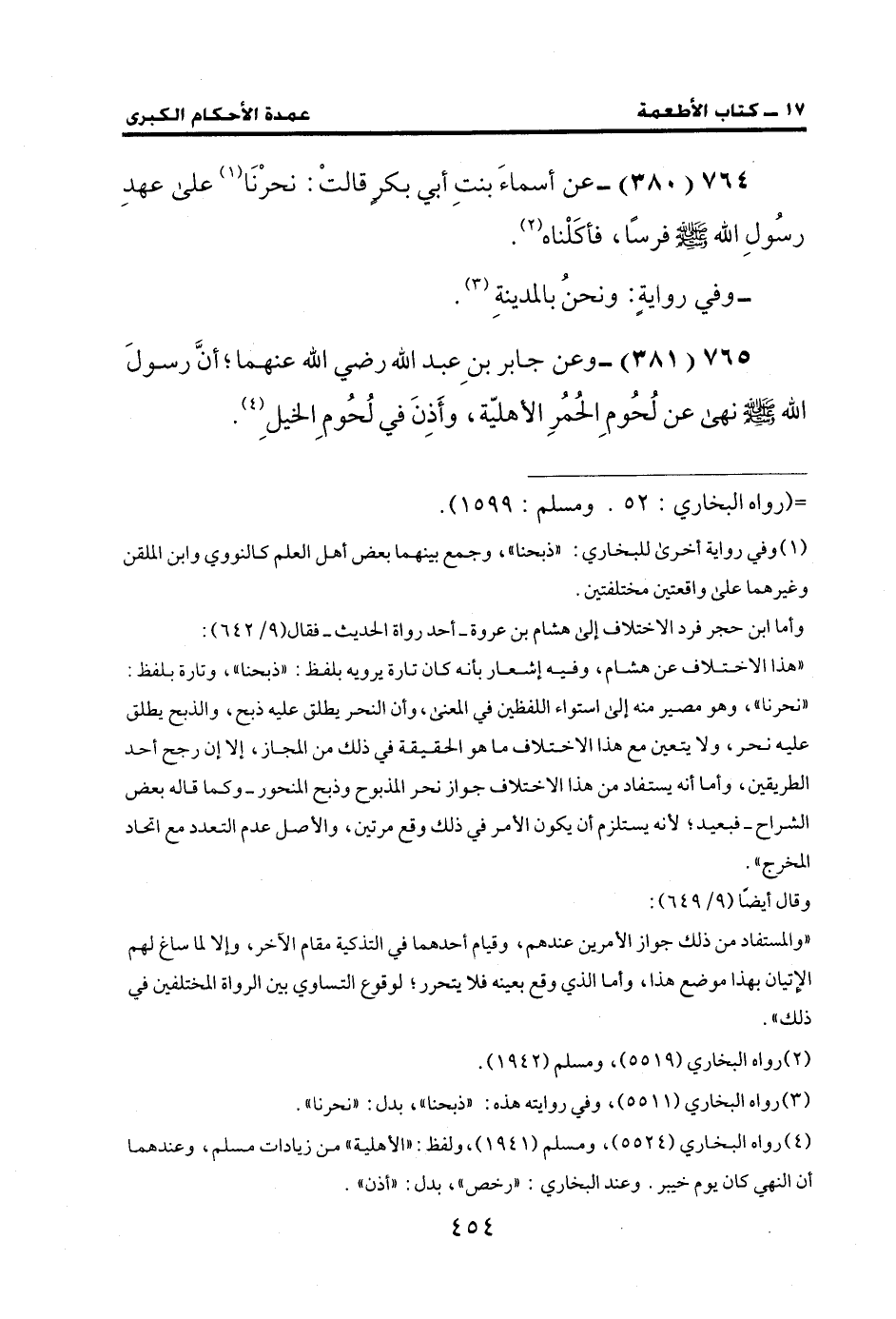 764 (385) - عن أسماءَ بنتِ أبي بكرٍ قالتْ: نحرْنَا (¬1) على عهدِ رسُولِ الله - صلى الله عليه وسلم - فرسًا، فأكَلْناه (¬2).