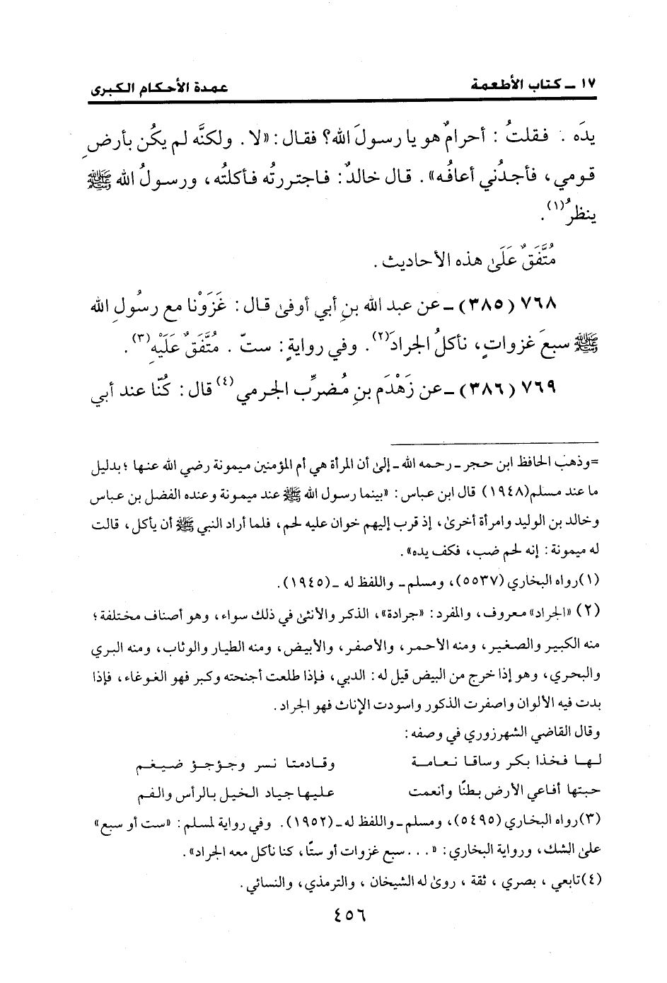 768 (385) - عن عبد الله بن أبي أوفى قال: غَزَوْنا مع رسُولِ الله - صلى الله عليه وسلم- سبع غزواتٍ، نأكلُ الجراد (¬2). وفي روايةٍ: ستّ. مُتَّفَقٌ عَلَيه (¬3).