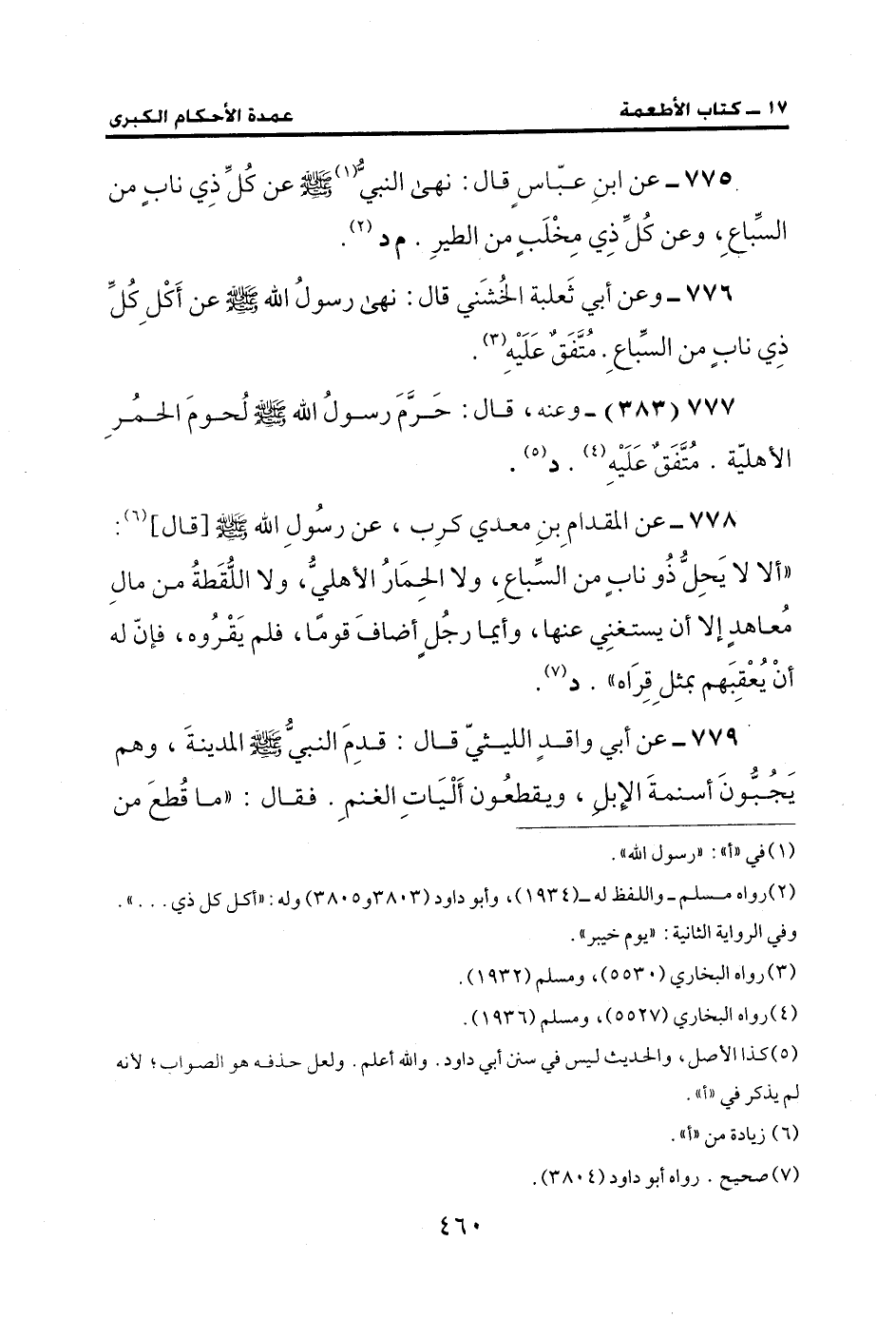 777) (383) - وعنه، قال: حَرَّم رسولُ الله - صلى الله عليه وسلم - لُحومَ الحمُر الأهليّة. مُتَّفَقٌ عَليهِ (¬4). د (¬5).