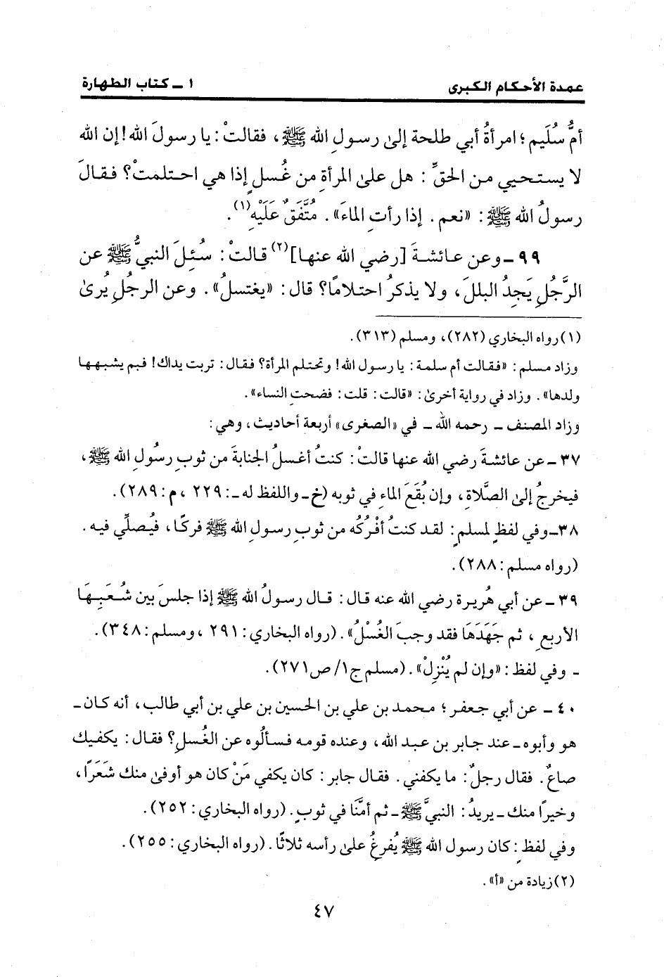 39 - عن أبي هُريرة رضي الله عنه قال: قال رسولُ الله - صلى الله عليه وسلم - إذا جلسَ بين شُعَبِهَا الأربعِ، ثم جَهَدَهَا فقد وجبَ الغُسْلُ". (رواه البخاري: 291، ومسلم: 348).
