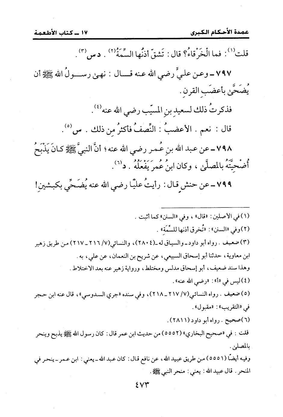798 - عن عبد الله بن عُمر رضي الله عنه؛ أنَّ النبيَّ - صلى الله عليه وسلم - كانَ يَذْبَحُ أُضْحِيَّتَهُ بالمصلَّى، وكان ابنُ عُمرَ يَفْعَلُهُ. د (¬6).