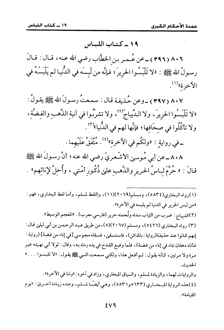 806 (396) - عن عُمر بنِ الخطَّاب رضي الله عنه، قال: قالَ رسولُ الله - صلى الله عليه وسلم -: "لا تَلْبَسُوا الحرِيرَ؛ فإنَّه من لَبِسَه في الدُّنيا لم يَلْبَسْهُ في الآخرةِ" (¬1).