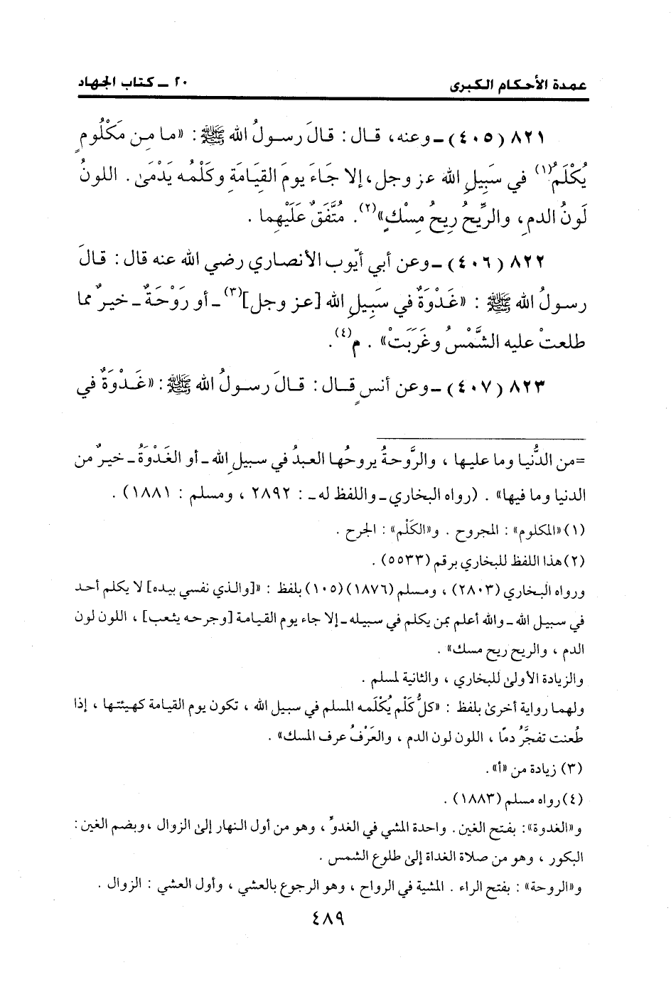 821 (405) - وعنه، قال: قالَ رسولُ الله - صلى الله عليه وسلم -: "ما مِن مَكْلُومٍ يُكْلَم (¬1) في سَبِيل الله -عز وجل-، إلا جَاءَ يومَ القِيَامَةِ وكَلْمُه يَدْمَى. اللونُ لَونُ الدم، والرِّيحُ رِيحُ مِسكٍ" (¬2). مُتَفَقٌ عَلَيهِما.