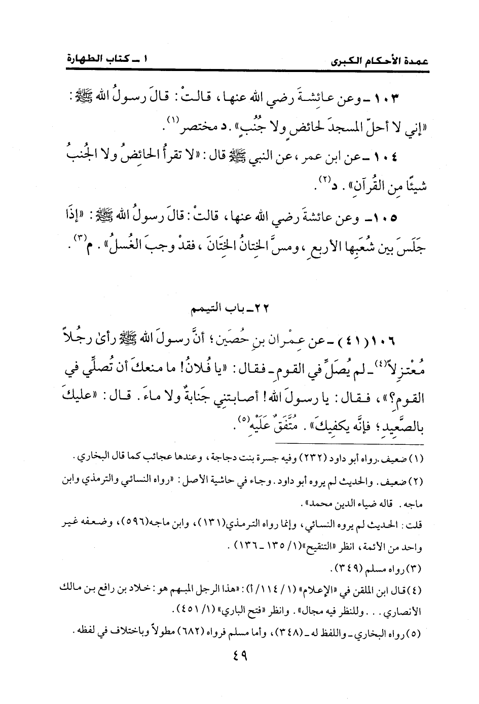 106 (41) - عن عِمْران بنِ حُصَين؛ أنَّ رسولَ الله - صلى الله عليه وسلم - رأى رجُلًا مُعْتزِلًا (¬4) - لم يُصَلِّ في القومِ - فقال: "يا فُلانُ! ما منعكَ أن تُصلِّي في القوم؟ "، فقال: يا رسولَ الله! أصابتنِي جَنابةٌ ولا ماءَ. قال: "عليكَ بالصَّعِيدِ؛ فإنَّه يكفِيكَ". مُتَّفَقٌ عَلَيْهِ (¬5).