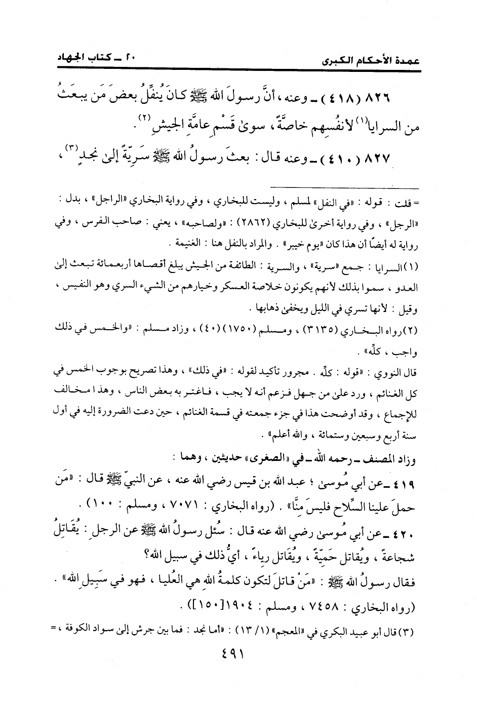826 (498) - وعنه، أن رسولَ الله - صلى الله عليه وسلم - كانَ يُنفِّلُ بعضَ مَن يبعَثُ من السرايا (¬1) لأنفُسِهم خاصَّةً، سوى قَسْمِ عامَّةِ الجيشِ (¬2).