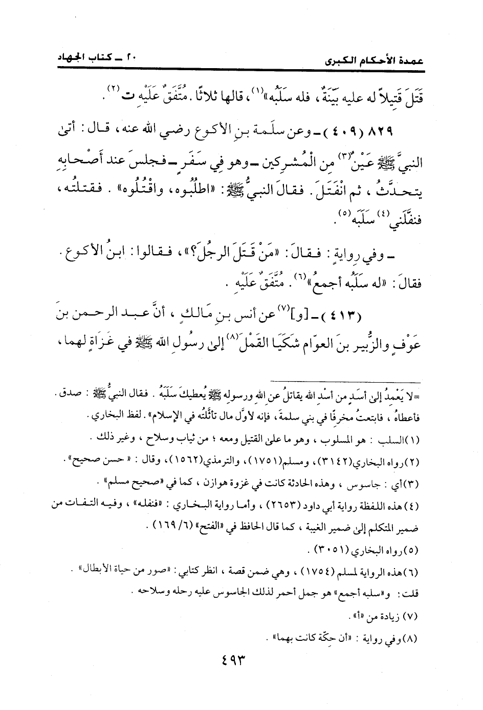 829 (409) - وعن سلَمة بنِ الأكوع رضي الله عنه، قال: أتى النبيَّ - صلى الله عليه وسلم - عَيْنٌ (¬3) مِن الْمُشرِكين- وهو فِي سَفَر- فجلسَ عند أَصْحابِهِ يتحدَّثُ، ثم انْفَتَلَ. فقالَ النبيُّ - صلى الله عليه وسلم -: "اطلُبُوه، واقْتُلُوه". فقتلتُه، فنفَّلَني (¬4) سَلَبَه (¬5).