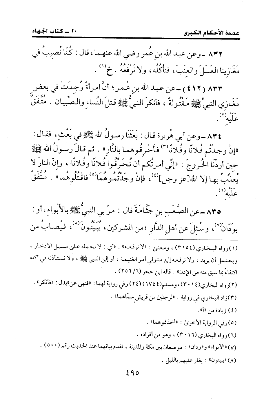 833 (412) - عن عبد الله بنِ عُمر؛ أنَّ امرأةً وُجِدَت في بعض مَغَازِي النبيِّ - صلى الله عليه وسلم - مَقْتُولةً، فأنكرَ النبيُّ - صلى الله عليه وسلم - قتلَ النِّساءِ والصِّبيان. مُتَّفَقٌ عَلَيْهِ (¬2).