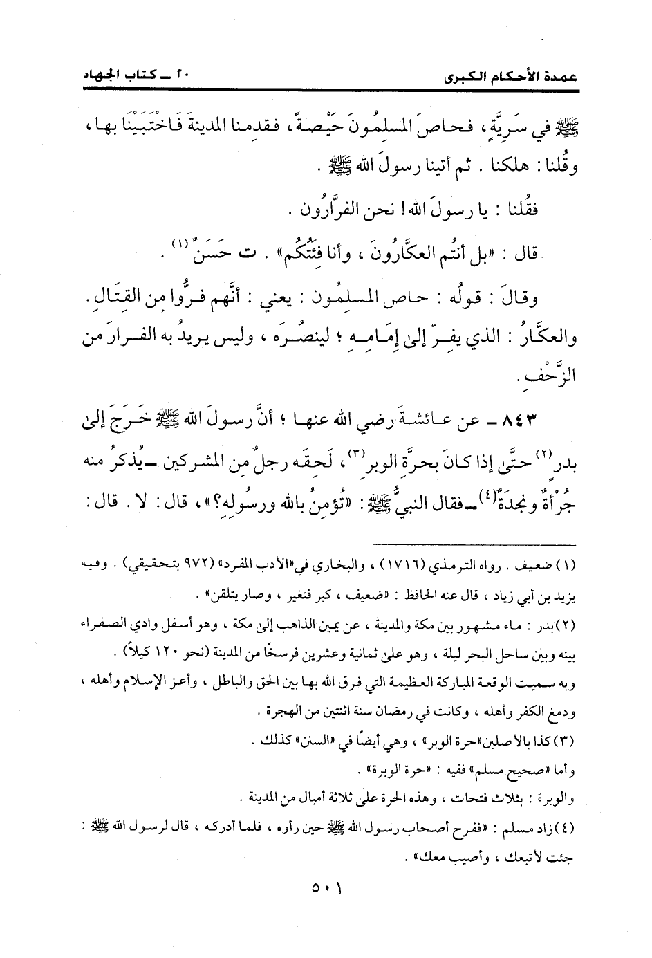 843 - عن عائشةَ رضي الله عنها؛ أنَّ رسولَ الله - صلى الله عليه وسلم - خَرَجَ إلى بدر (¬2) حتَى إذا كانَ بحرَّةِ الوبرِ (¬3)، لَحِقَه رجلٌ من المشركين - يُذكرُ منه جُرْأةٌ ونجدَةٌ (¬4) - فقال النبيُّ - صلى الله عليه وسلم -: "تُؤمِنُ بالله ورسُوَلِهِ؟ "، قال: لا. قال: