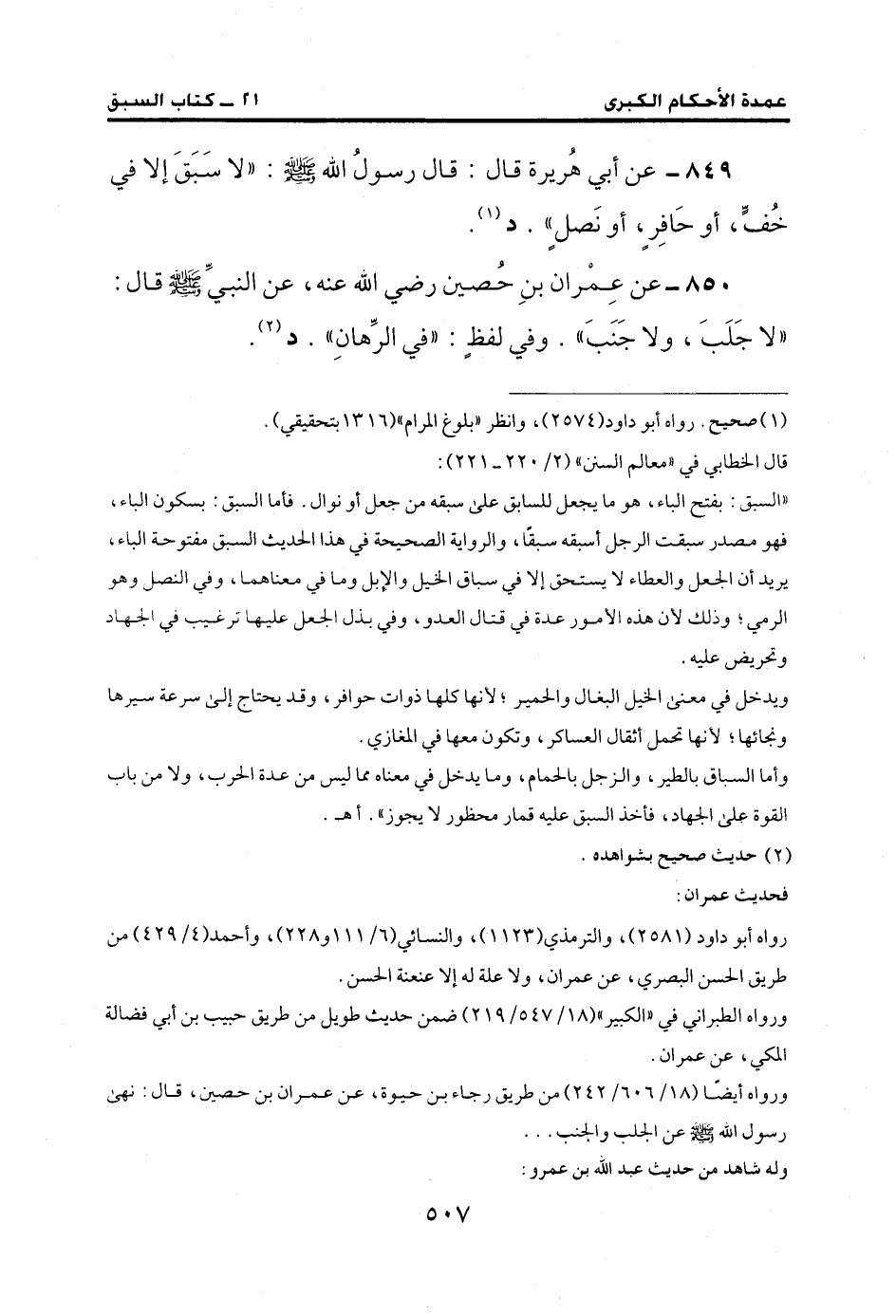 850 - عن عِمْران بنِ حصين رضي الله عنه، عن النبىِّ - صلى الله عليه وسلم - قال: "لا جَلَبَ، ولا جَنَبَ". وفي لفظٍ: "في الرِّهانِ". د (¬2).