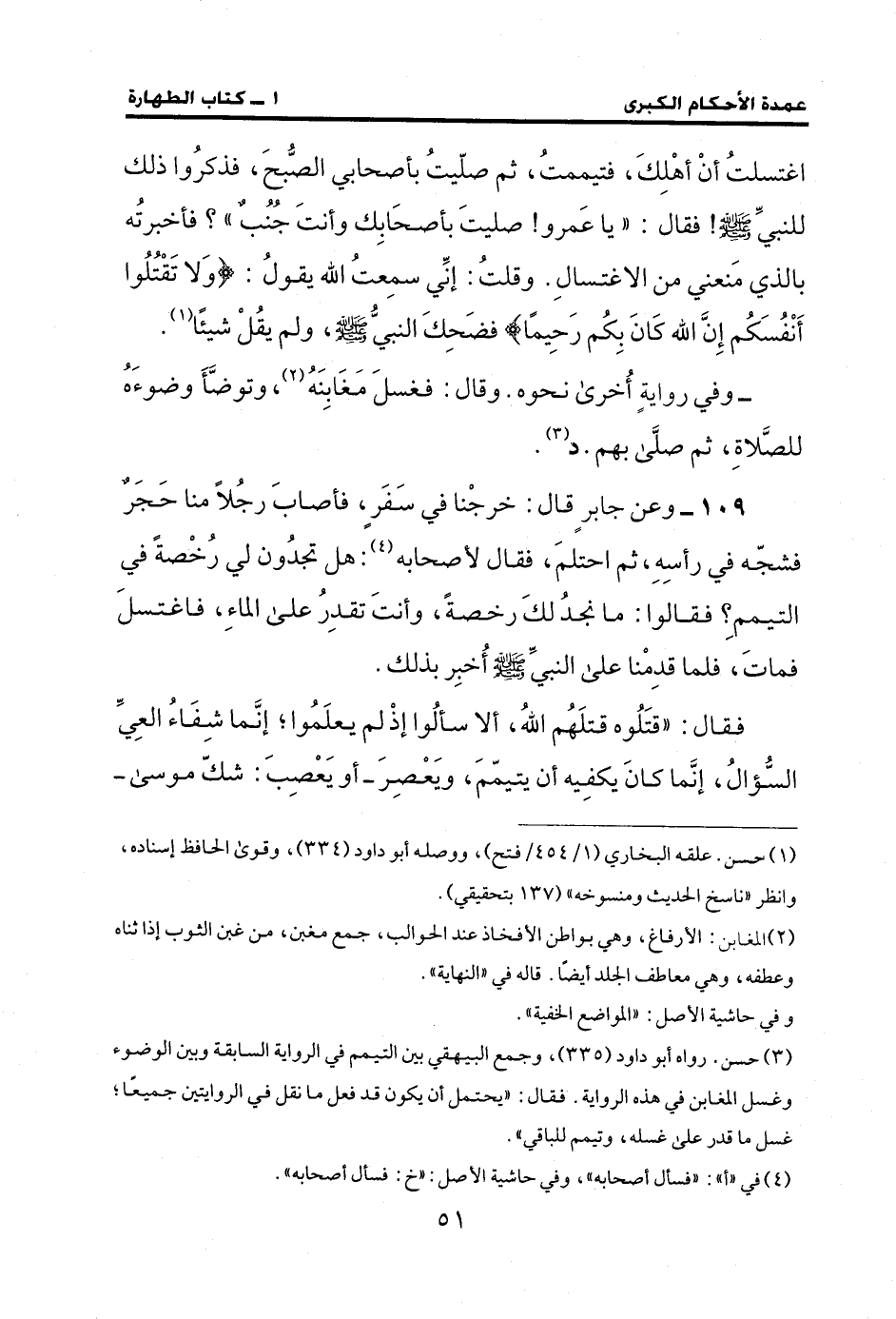 109 - وعن جابرٍ قال: خرجْنا في سَفَرٍ، فأصابَ رجُلًا منا حَجَرٌ فشجّه في رأسِهِ، ثم احتلمَ، فقال لأصحابه (¬4): هل تجدُون لي رُخْصةً في التيممِ؟ فقالوا: ما نجدُ لكَ رخصةً، وأنتَ تقدِرُ على الماءِ، فاغتسلَ فماتَ، فلما قدِمْنا على النبيِّ - صلى الله عليه وسلم - أُخبِر بذلك.