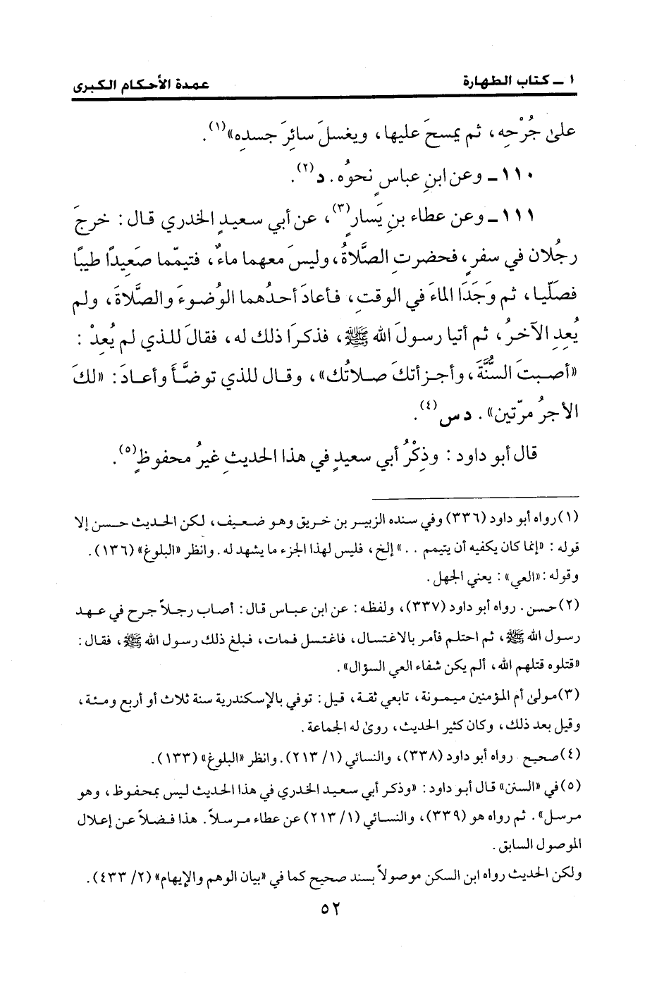 111 - وعن عطاء بنِ يَسارٍ (¬3)، عن أبي سعيدٍ الخدري قال: خرجَ رجُلان في سفرٍ، فحضرتِ الصَّلاةُ، وليسَ معهما ماءٌ، فتيمّما صَعِيدًا طيبًا فصَلّيا، ثم وَجَدَا الماءَ في الوقتِ، فأعادَ أحدُهما الوُضوءَ والصَّلاةَ، ولم يُعِدِ الآخرُ، ثم أتيا رسولَ الله - صلى الله عليه وسلم -، فذكرَا ذلك له، فقالَ للذي لم يُعِدْ: "أصبتَ السُّنَّةَ، وأجزأتكَ صلاتُك"، وقال للذي توضَّأَ وأعادَ: "لكَ الأجرُ مرّتين". د س (¬4).