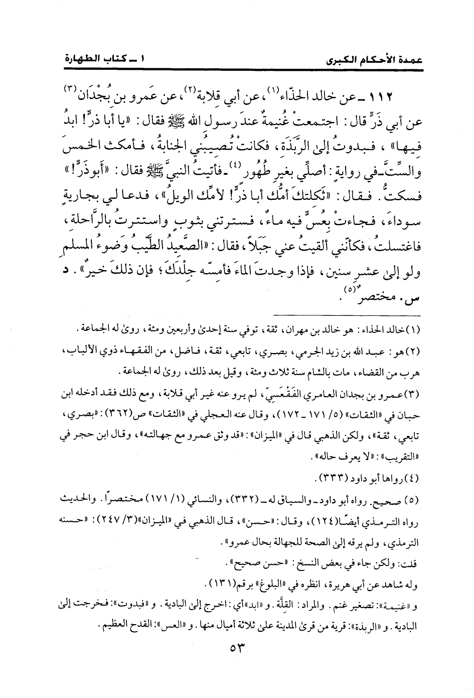 112 - عن خالد الحذّاء (¬1)، عن أبي قِلابة (¬2)، عن عَمرو بن بُجْدَان (¬3) عن أبي ذَرٍّ قال: اجتمعتْ غُنيمةٌ عندَ رسولِ الله - صلى الله عليه وسلم - فقال: "يا أَبا ذرٍّ! ابدُ فِيها"، فبدوتُ إلى الربَّذَةِ، فكانت تُصِيبُني الجنابةُ، فأمكث الخمسَ والسِّتَّ- في روايةٍ: أصلِّي بغيرِ طُهُور (¬4) - فأتيتُ النبيَّ - صلى الله عليه وسلم - فقال: "أَبوذَرٍّ! " فسكتُّ. فقال: "ثَكِلتكَ أمُّك أبا ذرٍّ! لأمِّك الويلُ"، فدعا لي بجاريةٍ سوداءَ، فجاءتْ بِعُسٍّ فيه ماءٌ، فسترتني بثوبٍ واستترتُ بالرَّاحلةِ، فاغتسلتُ، فكأنّني ألقيتُ عني جَبَلًا، فقال: "الصَّعِيدُ الطَّيّبُ وَضوءُ المسلمِ ولو إلى عشرِ سنين، فإذا وجدتَ الماءَ فأمِسّه جِلْدَكَ؛ فإن ذلكَ خيرٌ". د س. مختصرٌ (¬5).