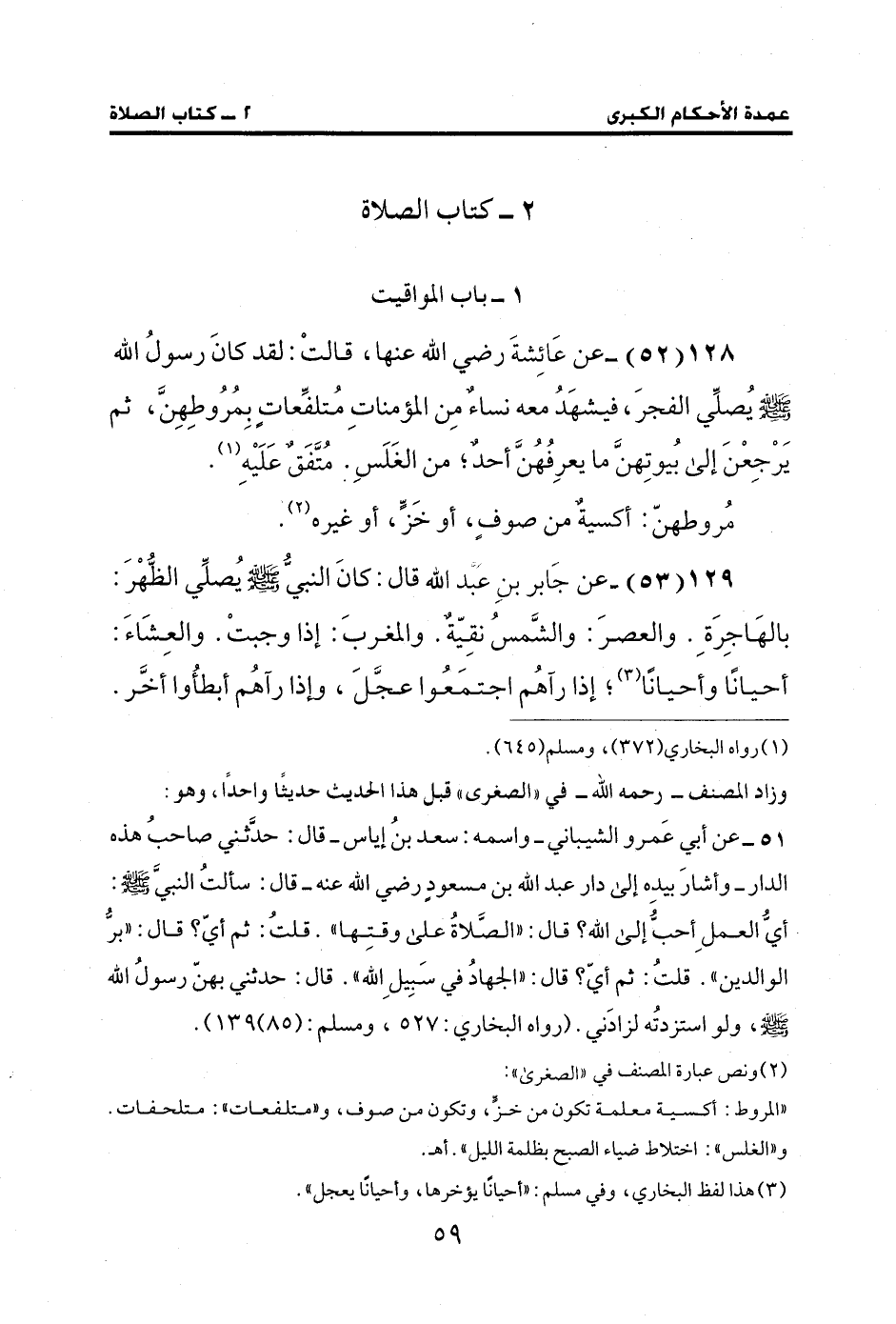 128 (52) - عن عَائِشةَ رضي الله عنها، قالتْ: لقد كانَ رسولُ الله - صلى الله عليه وسلم - يُصلِّي الفجرَ، فيشهَدُ معه نساءٌ مِن المؤمناتِ مُتلفِّعاتٍ بِمُرُوطِهِنَّ، ثم يَرْجِعْنَ إلى بُيوتِهنَّ ما يعرِفُهُنَّ أحدٌ؛ من الغَلَسِ. مُتَّفَقٌ عَلَيْهِ (¬1).
