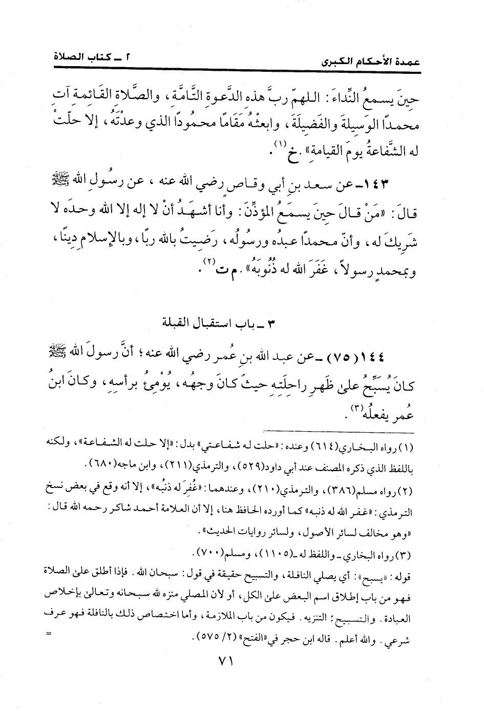 144 (75) - عن عبد الله بنِ عُمر رضي الله عنه؛ أنَّ رسولَ الله - صلى الله عليه وسلم - كانَ يُسَبِّحُ علي ظَهرِ راحِلَتِهِ حيثَ كانَ وجهُه، يُوْمِئُ برأسِهِ، وكانَ ابنُ عُمر يَفْعلُه (¬3).