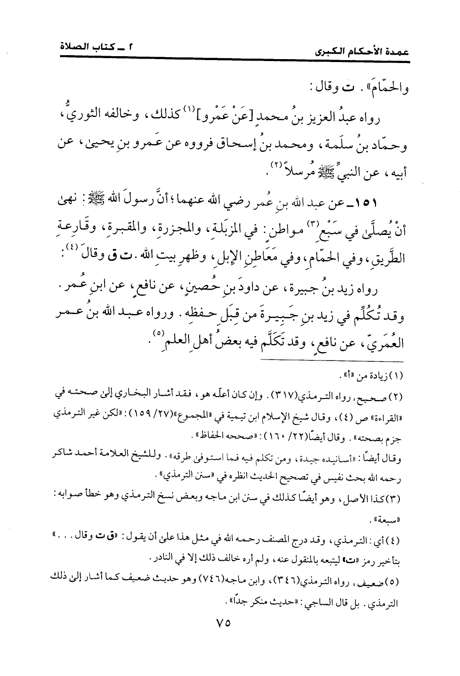 151 - عن عبد الله بنِ عمر رضي الله عنهما؛ أنَّ رسولَ الله - صلى الله عليه وسلم -: نهى أنْ يُصلَّى في سَبْعِ (¬3) مواطنٍ: في المزبَلةِ، والمجزرةِ، والمقبرةِ، وقَارِعةِ الطَّريقِ، وفي الحمّامِ، وفي مَعَاطِنِ الإِبل، وظهرِ بيتِ الله. ت ق وقالَ (¬4):