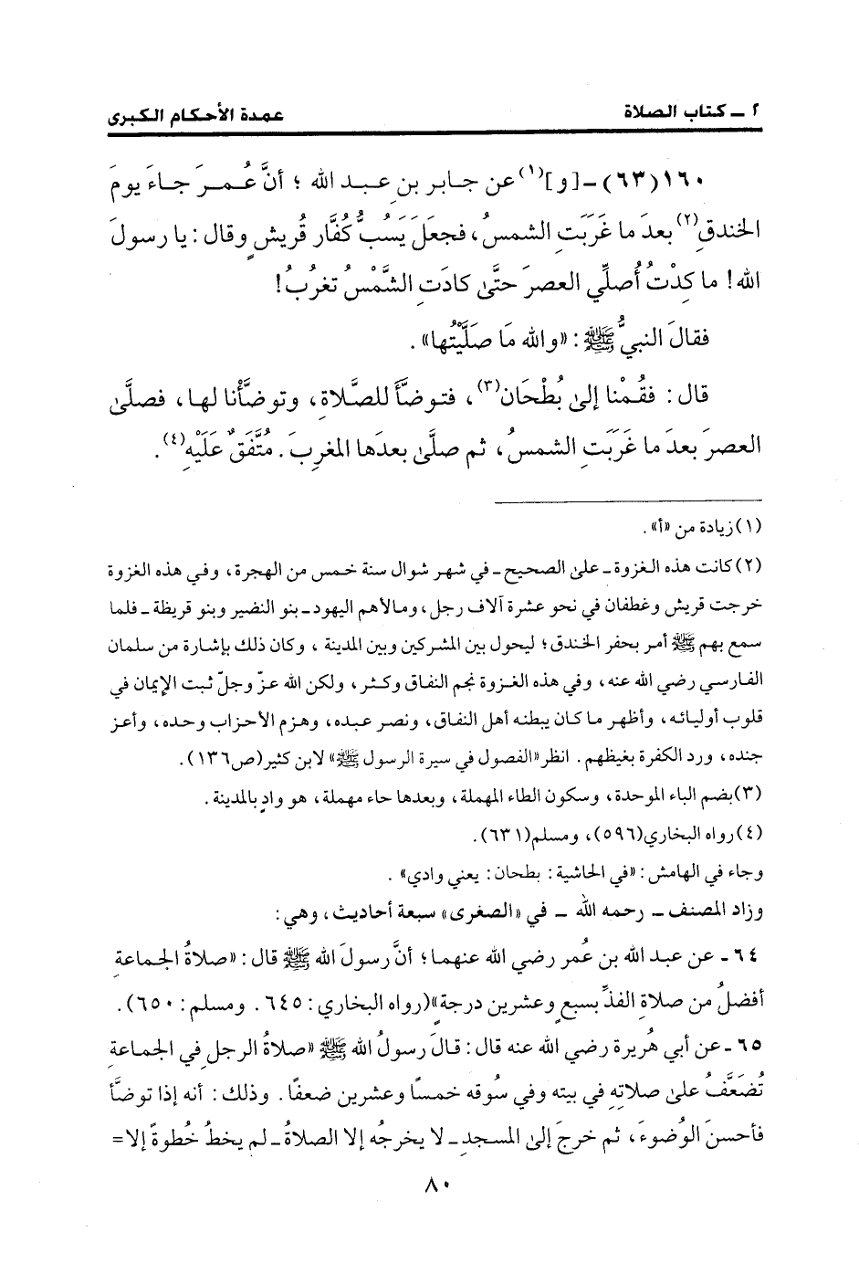 160 (63) -[و] (¬1) عن جابر بنِ عبد الله؛ أنَّ عُمرَ جاءَ يومَ الخندقِ (¬2) بعدَ ما غَرَبَتِ الشمسُ، فجعَلَ يَسُبُّ كُفَّار قُريشٍ وقال: يا رسولَ الله! ما كِدْتُ أُصلِّي العصرَ حتَّى كادَتِ الشَّمْسُ تغرُبُ!