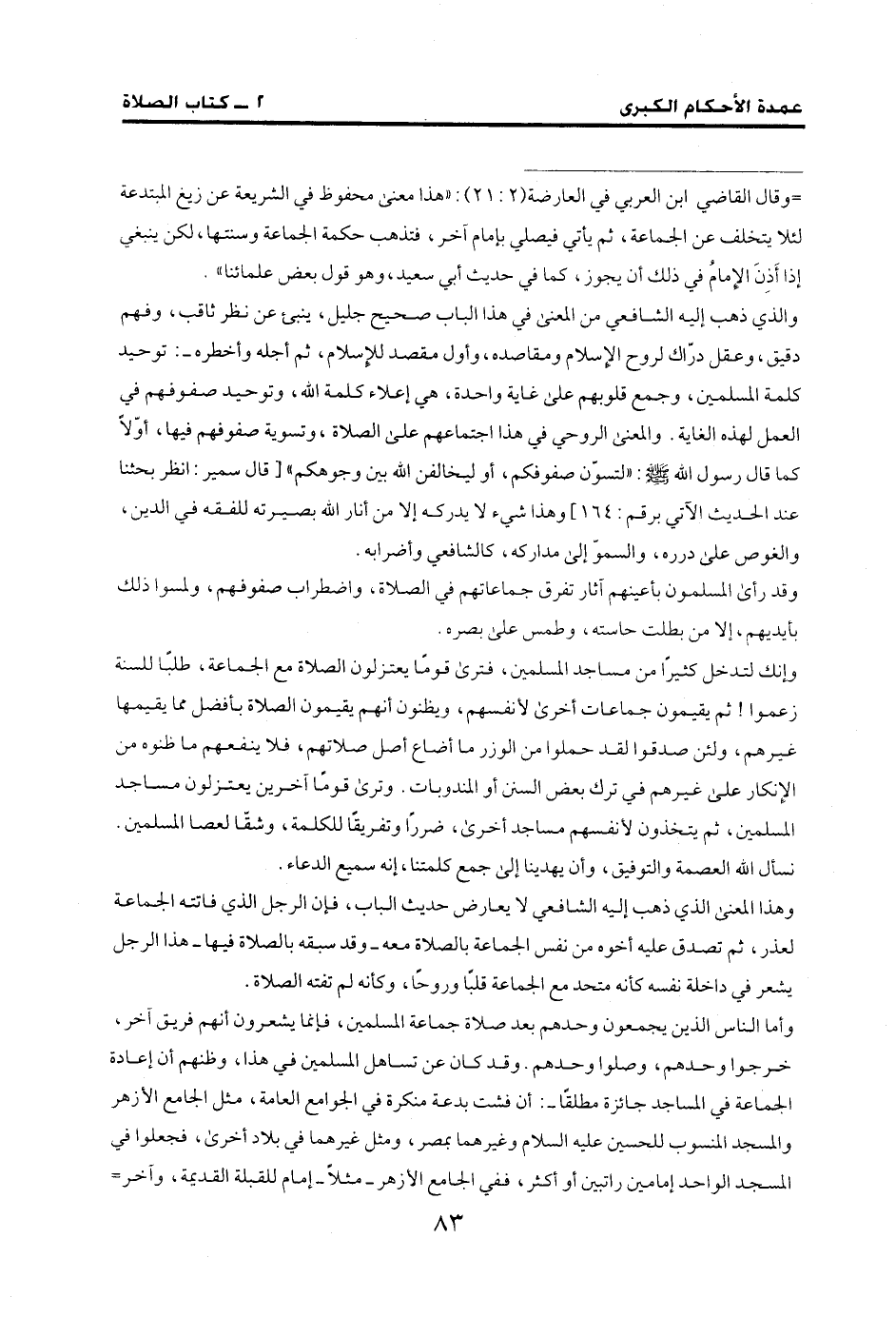 والذي ذهب إليه الشافعي من المعنى في هذا الباب صحيح جليل، ينبئ عن نظر ثاقب، وفهم دقيق، وعقل درّاك لروح الإسلام ومقاصده، وأول مقصد للإسلام، ثم أجله وأخطره-: توحيد كلمة المسلمين، وجمع قلوبهم على غاية واحدة، هي إعلاء كلمة الله، وتوحيد صفوفهم في العمل لهذه الغاية. والمعنى الروحي في هذا اجتماعهم على الصلاة، وتسوية صفوفهم فيها، أوّلًا كما قال رسول الله - صلى الله عليه وسلم -: "لتسون صفوفكم، أو ليخالفن الله بين وجوهكم" [قال سمير: انظر بحثنا عند الحديث الآتي برقم: 164] وهذا شيء لا يدركه إلا من أنار الله بصيرته للفقه في الدين، والغوص على درره، والسموّ إلى مداركه، كالشافعي وأضرابه.