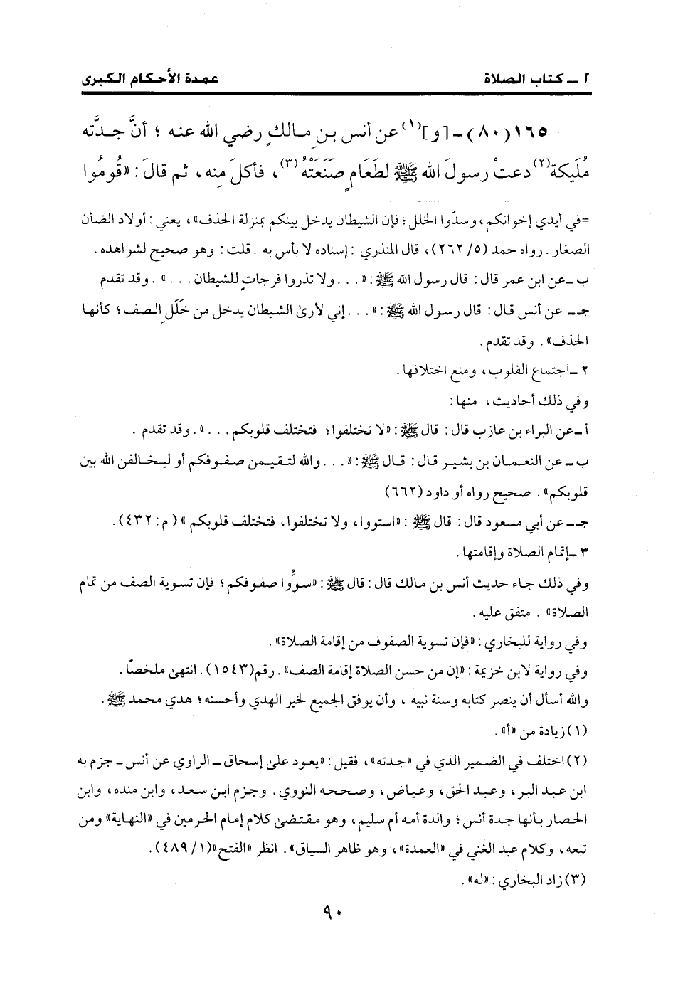 165 (80) -[و] (¬1) عن أنس بنِ مالكٍ رضي الله عنه؛ أنَّ جدَّتهُ مُليكة (¬2) دعتْ رسول الله - صلى الله عليه وسلم - لطَعَامٍ صَنَعَتْهُ (¬3)، فأكلَ مِنه، ثم قال: "قُومُوا