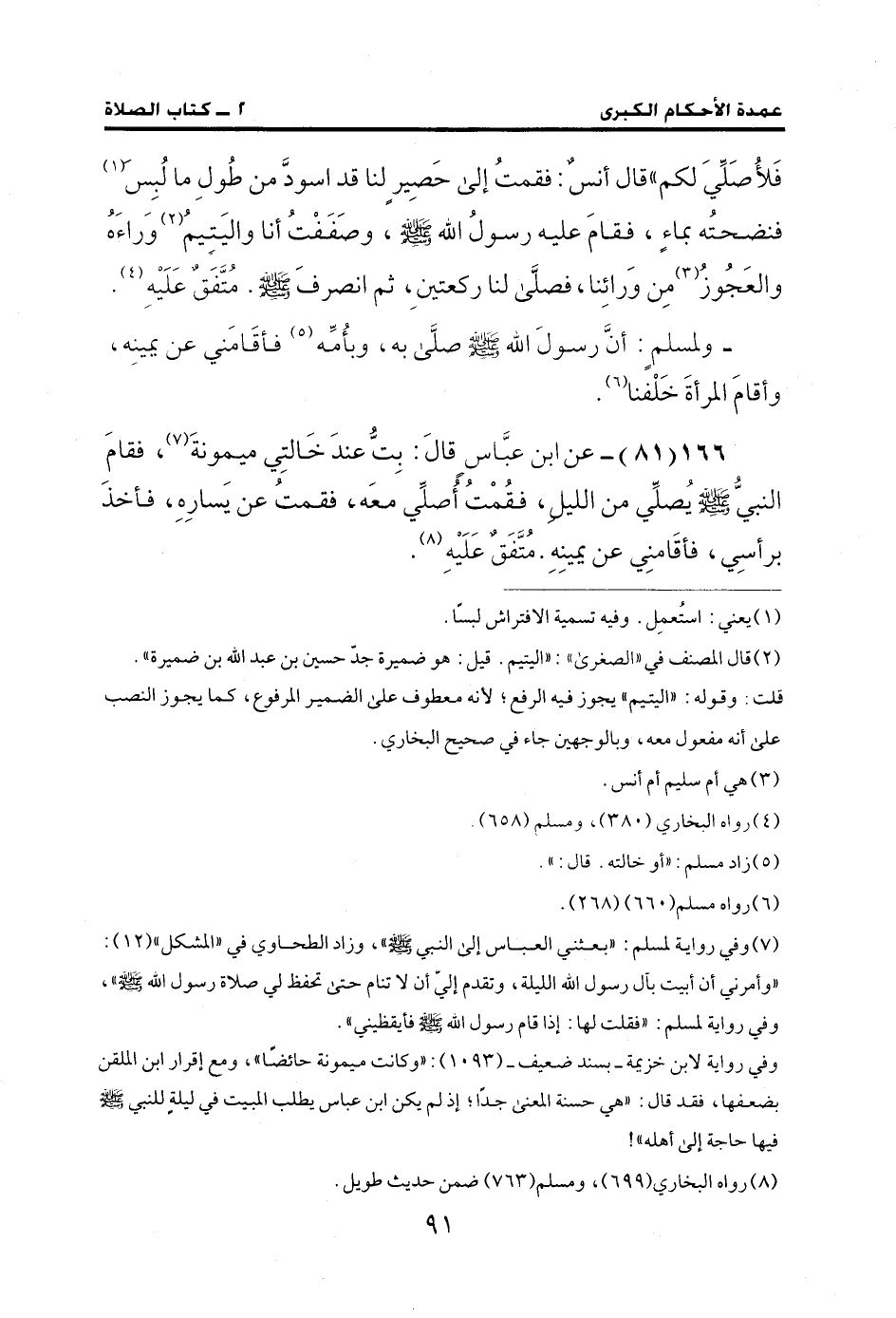 166 (81) - عن ابن عبَّاس قالَ: بِتُّ عندَ خَالتِي ميمونةَ (¬7)، فقامَ النبيُّ - صلى الله عليه وسلم - يصلِّي من الليل، فقُمْتُ أُصلِّي معَه، فقمتُ عن يَسارِه، فأخذَ برأسِي، فأقَامنِي عن يمينِهِ. مُتَّفَقٌ عَلَيْهِ (¬8).