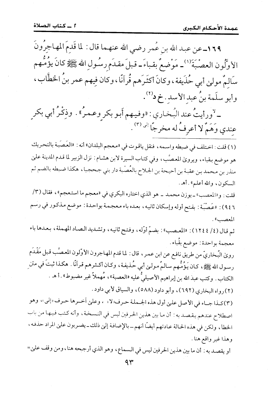 169 - عن عبد الله بنِ عُمر رضي الله عنهما قال: لما قَدِمَ المهاجِرُونَ الأوَّلون العصْبَةَ (¬1) - مَوْضعٌ بقباءَ - قبلَ مقدَم رِسُولِ الله - صلى الله عليه وسلم - كَانَ يؤُمُّهم سَالِمٌ مولى أبي حُذَيفة، وكانَ أكثَرَهم قُرآنًا، وكان فِيهم عمر بنُ الخطَّاب، وأبو سلَمة بنُ عبدِ الأسدِ. خ د (¬2).