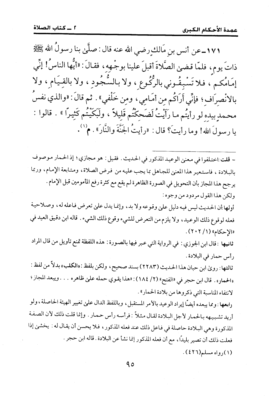 171 - عن أنس بنِ مَالكٍ رضي الله عنه قال: صلَّى بنا رسولُ الله - صلى الله عليه وسلم - ذاتَ يومٍ، فلمّا قضى الصَّلاةَ أقبلَ علينا بوجْهِهِ، فقالَ: "أيُّها الناسُ! إنِّي إمَامُكم، فلا تَسْبِقُوني بالرُّكُوعِ، ولا بالسُّجُودِ، ولا بالقِيَامِ، ولا بالانْصِرَافِ؛ فإنِّي أَرَاكُم مِن أمَامِي، ومِن خَلْفي". ثم قالَ: "والذي نفسُ محمدٍ بيدِهِ لو رأيتُم ما رَأَيْتُ لَضَحِكْتُم قَلِيلًا، ولَبَكَيْتُم كَثِيرًا". قالوا: يا رسولَ الله! وما رأيتَ؟ قال: "رأيتُ الجَنَّةَ والنَّارَ". م (¬1).