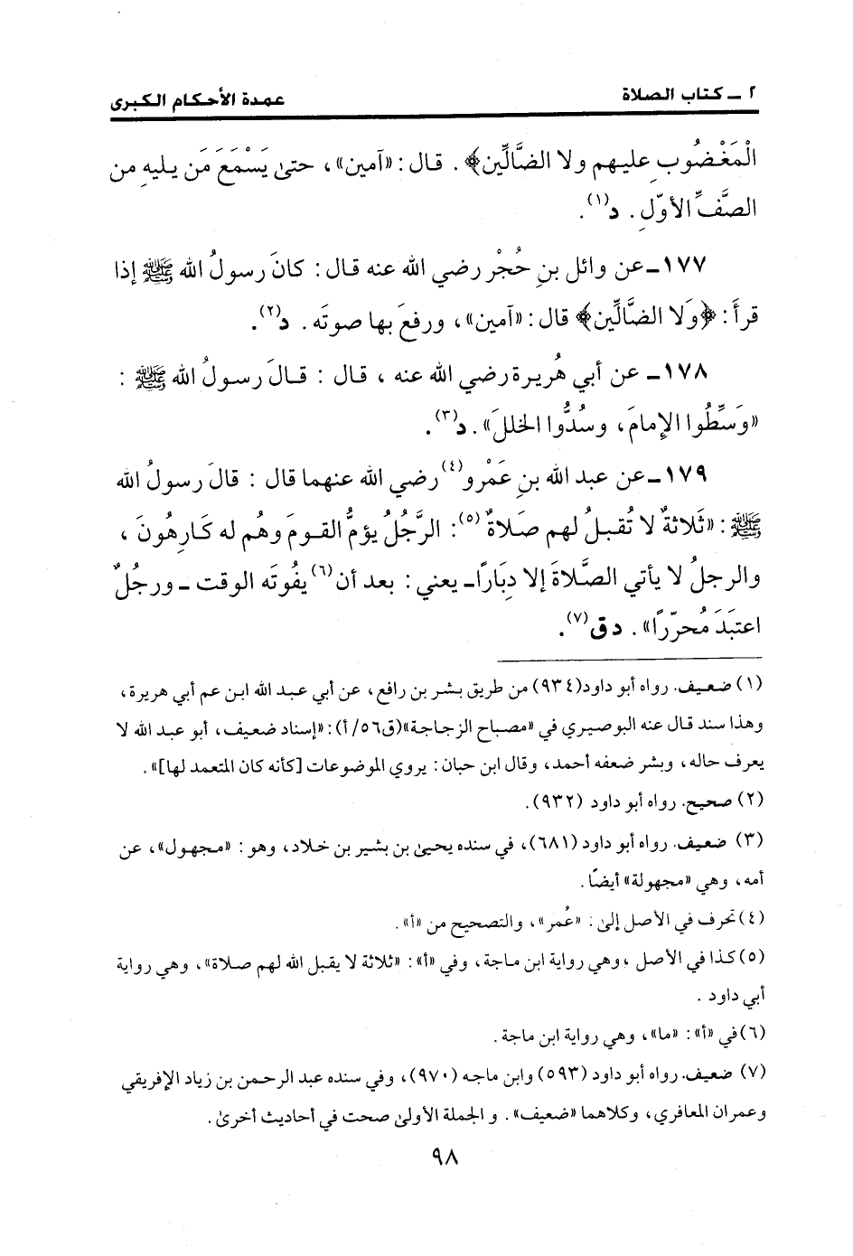177 - عن وائل بنِ حُجْر رضي الله عنه قال: كانَ رسولُ الله - صلى الله عليه وسلم - إذا قرأَ: {وَلَا الضَّالِّينَ} قال: "آمين"، ورفعَ بها صوتَه. د (¬2).