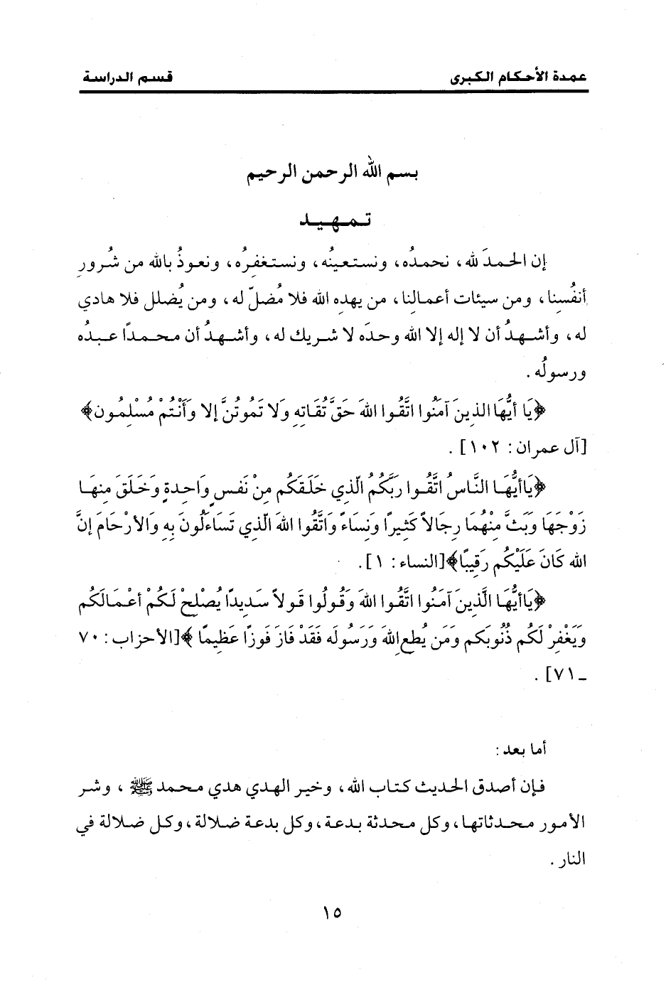 إن الحمدَ لله، نحمدُه، ونستعينُه، ونستغفِرُه، ونعوذُ بالله من شُرورِ أنفُسِنا، ومن سيئات أعمالِنا، من يهدِه الله فلا مُضلّ له، ومن يُضلل فلا هادي له، وأشهدُ أن لا إله إلَّا الله وحدَه لا شريك له، وأشهدُ أن محمدًا عبدُه ورسولُه.