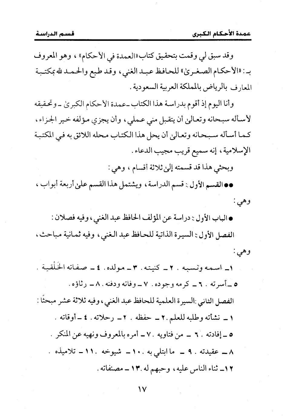 وقد سبق لي وقمت بتحقيق كتاب "العمدة في الأحكام"، وهو المعروف بـ: "الأحكام الصغرى" للحافظ عبد الغني، وقد طبع والحمد لله بمكتبة المعارف بالرياض بالمملكة العربية السعودية.