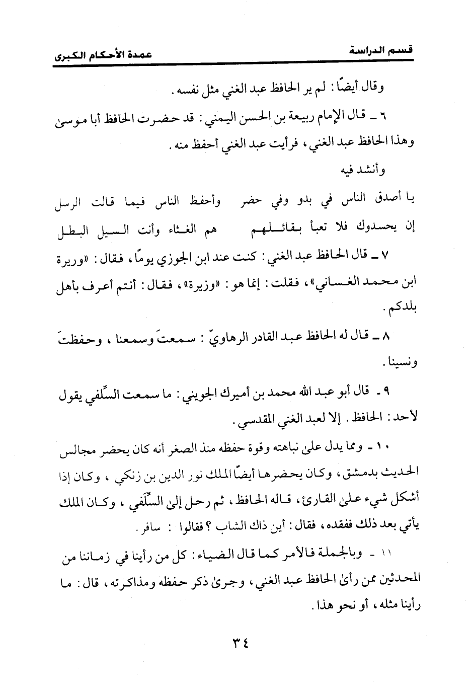 11 - وبالجملة فالأمر كما قال الضياء: كل من رأينا في زماننا من المحدثين ممن رأى الحافظ عبد الغني، وجرى ذكر حفظه ومذاكرته، قال: ما رأينا مثله، أو نحو هذا.