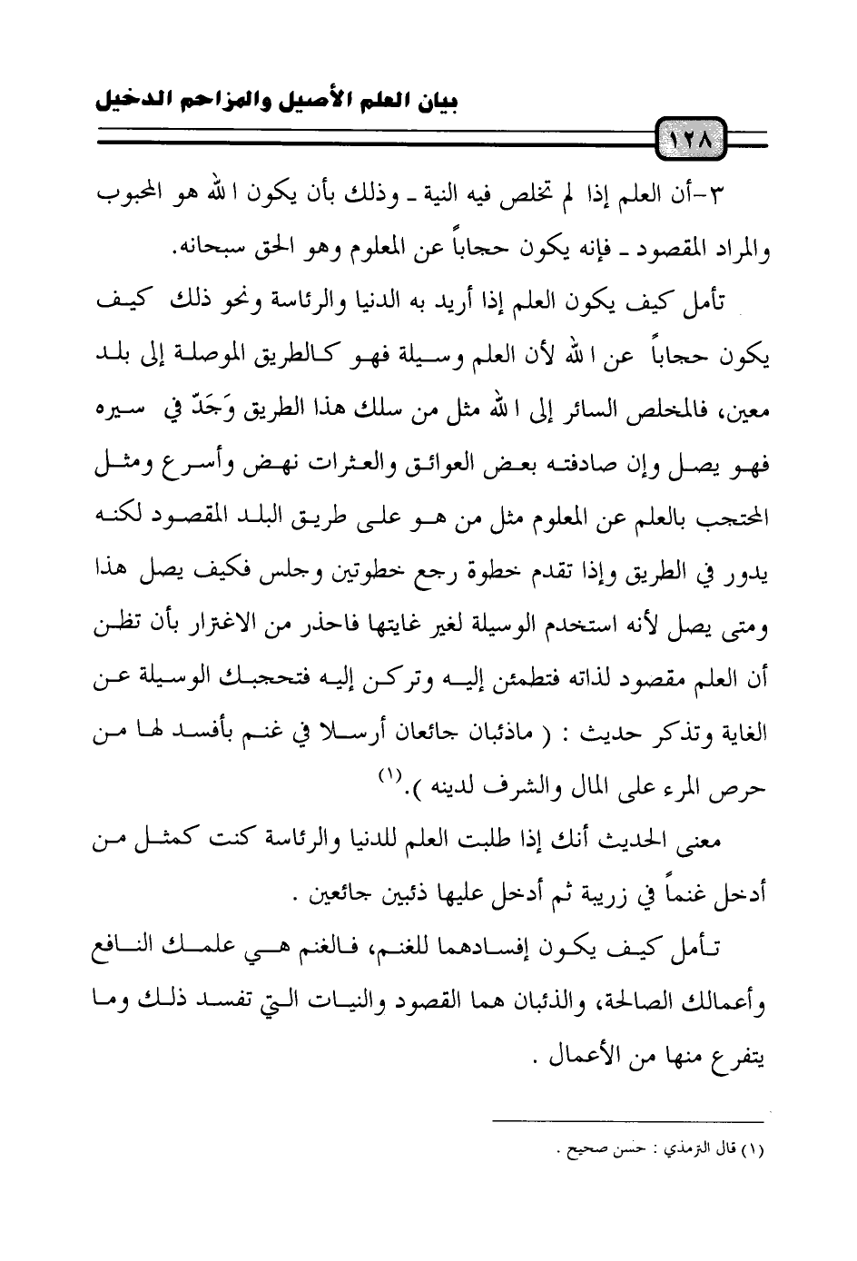 3 - أن العلم إذا لم تخلص فيه النية ـ وذلك بأن يكون الله هو المحبوب والمراد المقصود ـ فإنه يكون حجاباً عن المعلوم وهو الحق سبحانه.