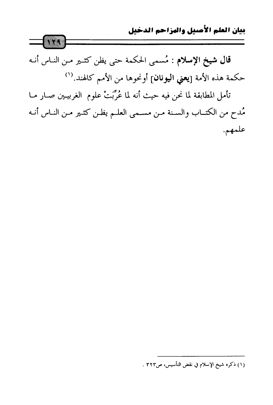 تأمل المطابقة لما نحن فيه حيث أنه لما عُرِّبَتْ علوم الغربيين صار ما مُدح من الكتاب والسنة من مسمى العلم يظن كثير من الناس أنه علمهم.