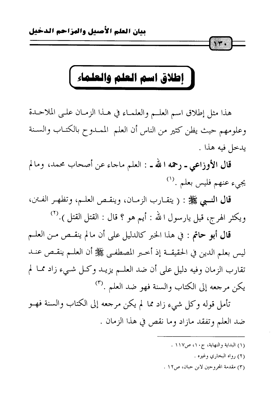 قال أبو حاتم: في هذا الخبر كالدليل على أن مالم ينقص من العلم ليس بعلم الدين في الحقيقة إذ أخبر المصطفى - صلى الله عليه وسلم - أن العلم ينقص عند تقارب الزمان وفيه دليل على أن ضد العلم يزيد وكل شيء زاد مما لم يكن مرجعه إلى الكتاب والسنة فهو ضد العلم. (¬3)