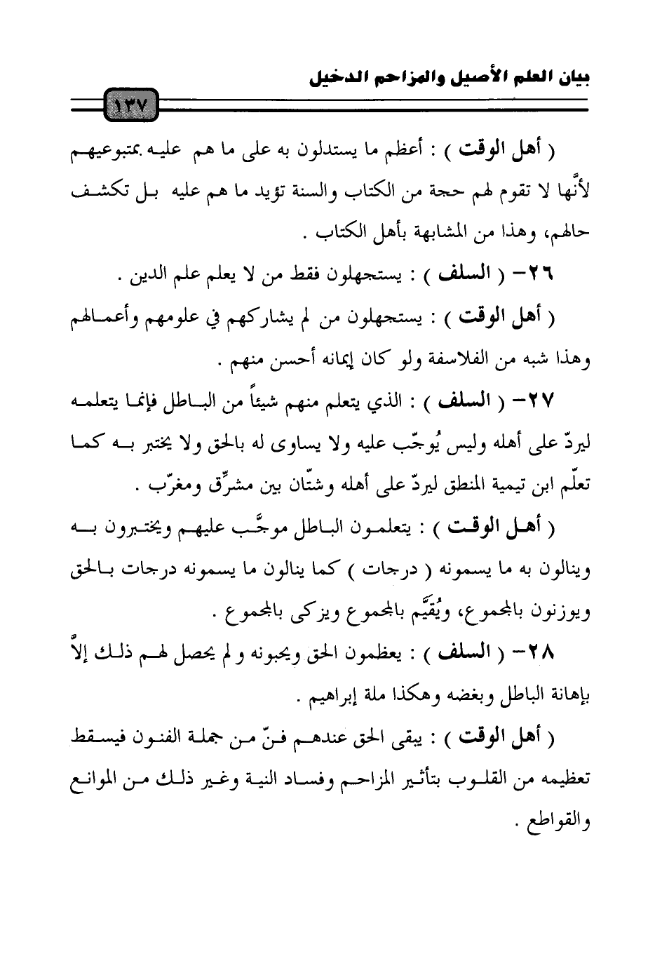 (أهل الوقت): يستجهلون من لم يشاركهم في علومهم وأعمالهم وهذا شبه من الفلاسفة ولو كان إيمانه أحسن منهم.