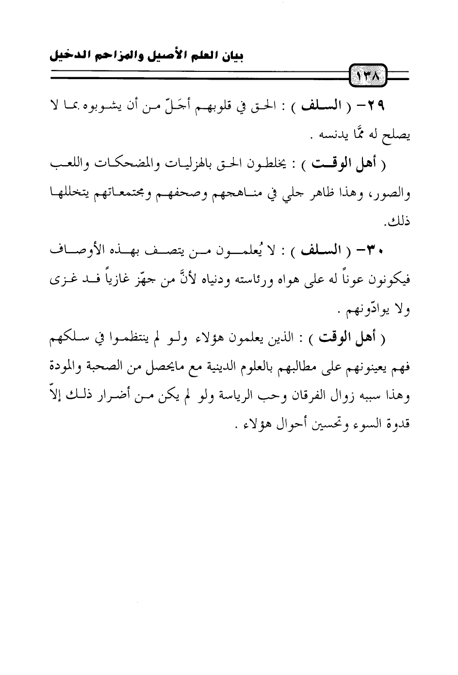 (أهل الوقت): يخلطون الحق بالهزليات والمضحكات واللعب والصور، وهذا ظاهر جلي في مناهجهم وصحفهم ومجتمعاتهم يتخللها ذلك.
