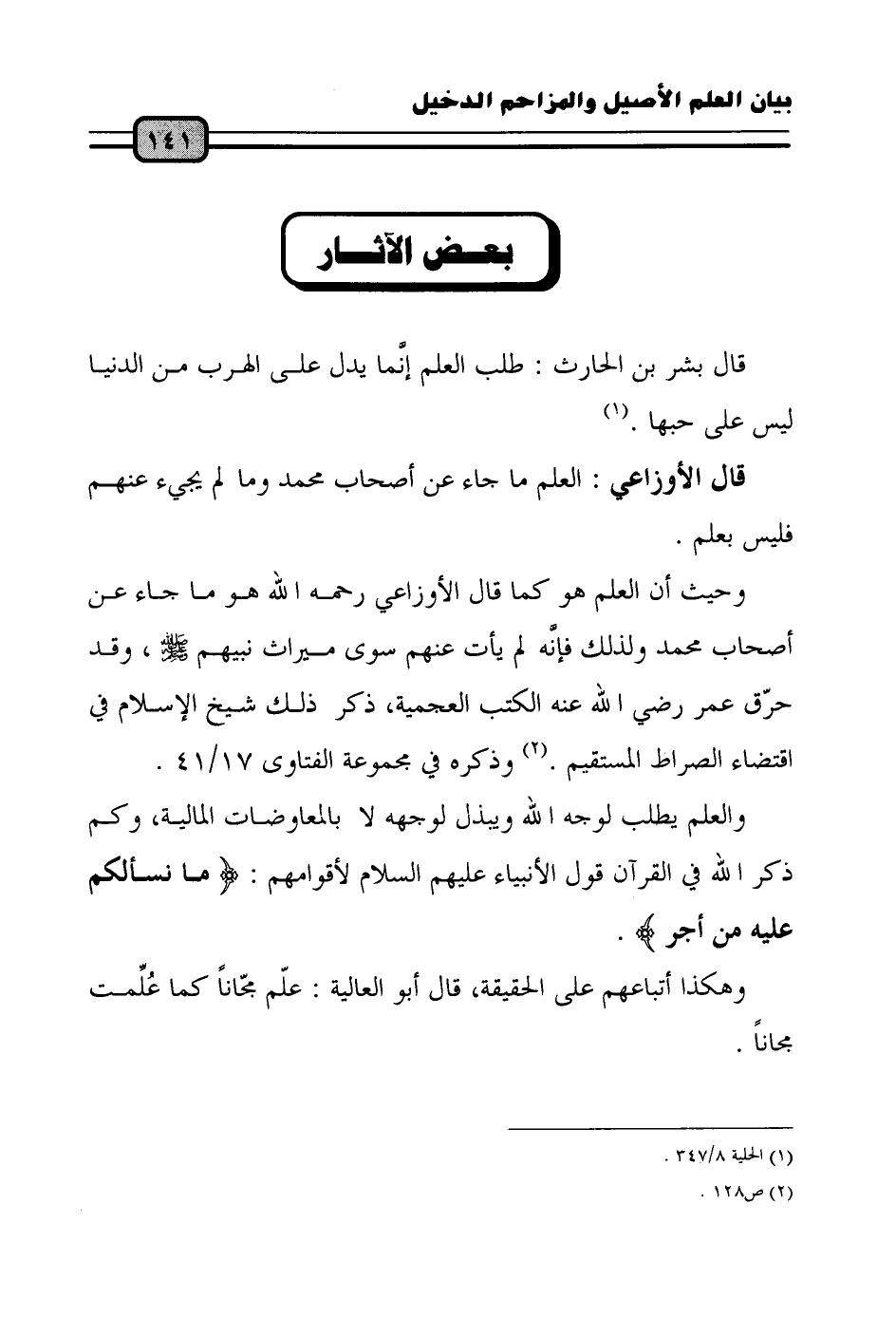 وحيث أن العلم هو كما قال الأوزاعي رحمه الله هو ما جاء عن أصحاب محمد ولذلك فإنَّه لم يأت عنهم سوى ميراث نبيهم - صلى الله عليه وسلم -، وقد حرّق عمر رضي الله عنه الكتب العجمية، ذكر ذلك شيخ الإسلام في اقتضاء الصراط المستقيم. (¬2)
