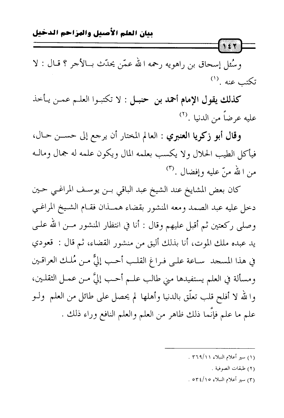 كذلك يقول الإمام أحمد بن حنبل: لا تكتبوا العلم عمن يأخذ عليه عرضاً من الدنيا. (¬2)