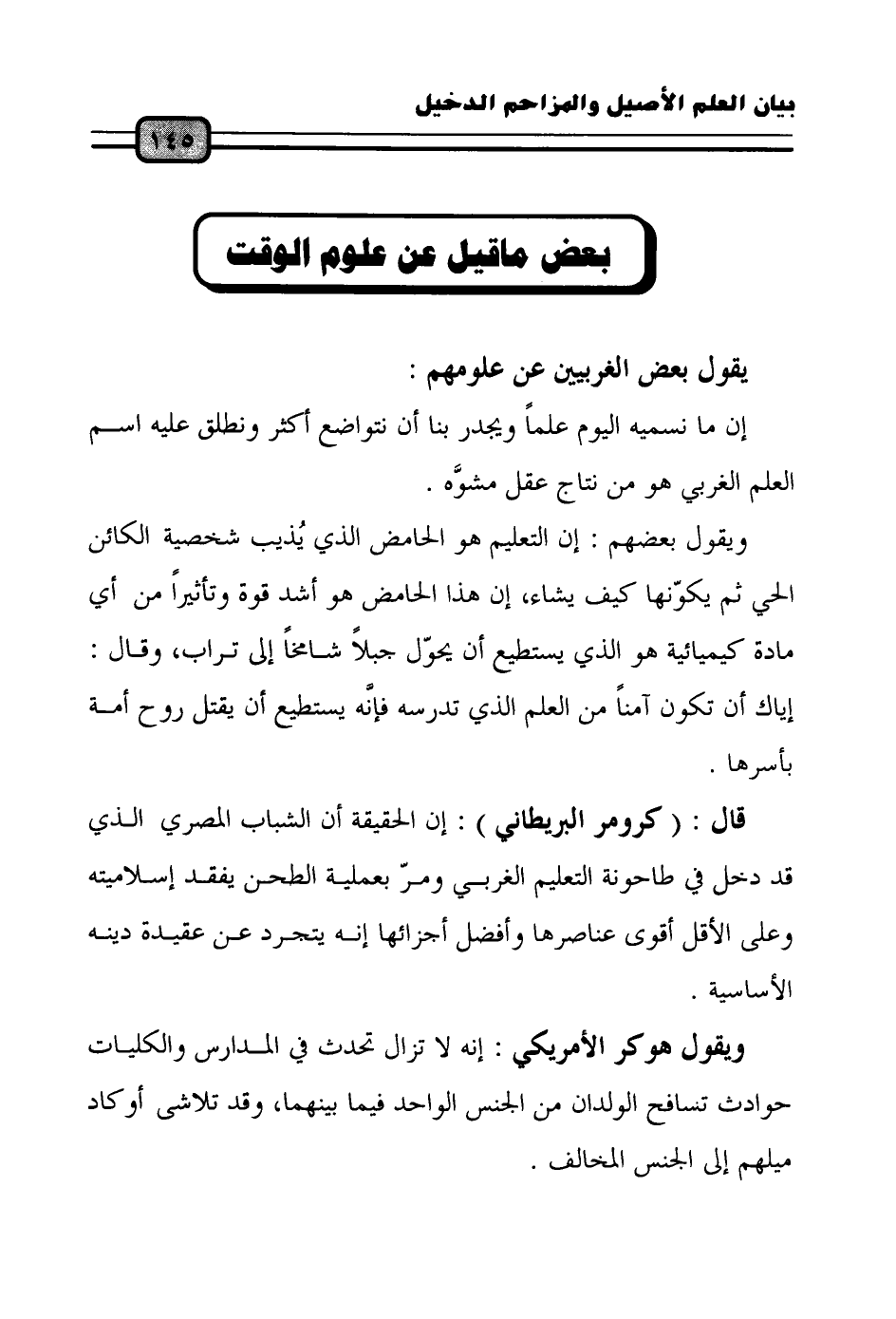 قال: (كرومر البريطاني): إن الحقيقة أن الشباب المصري الذي قد دخل في طاحونة التعليم الغربي ومرّ بعملية الطحن يفقد إسلاميته وعلى الأقل أقوى عناصرها وأفضل أجزائها إنه يتجرد عن عقيدة دينه الأساسية.