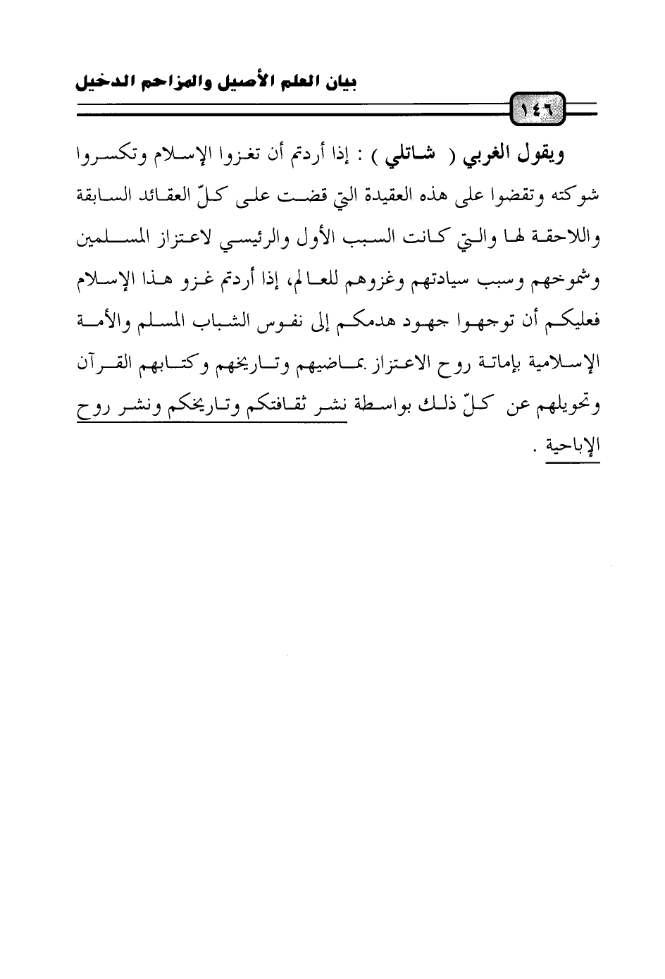 ويقول الغربي (شاتلي): إذا أردتم أن تغزوا الإسلام وتكسروا شوكته وتقضوا على هذه العقيدة التي قضت على كلّ العقائد السابقة واللاحقة لها والتي كانت السبب الأول والرئيسي لاعتزاز المسلمين وشموخهم وسبب سيادتهم وغزوهم للعالم، إذا أردتم غزو هذا الإسلام فعليكم أن توجهوا جهود هدمكم إلى نفوس الشباب المسلم والأمة الإسلامية بإماتة روح الاعتزاز بماضيهم وتاريخهم وكتابهم القرآن وتحويلهم عن كلّ ذلك بواسطة نشر ثقافتكم وتاريخكم ونشر روح الإباحية.