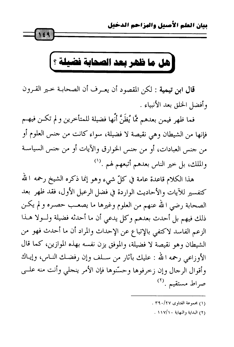 فما ظهر فيمن بعدهم ممَّا يُظَنَّ أنَّها فضيلة للمتأخرين ولم تكن فيهم فإنها من الشيطان وهي نقيصة لا فضيلة، سواء كانت من جنس العلوم أو من جنس العبادات، أو من جنس الخوارق والآيات أو من جنس السياسة والملك، بل خير الناس بعدهم أتبعهم لهم. (¬1)