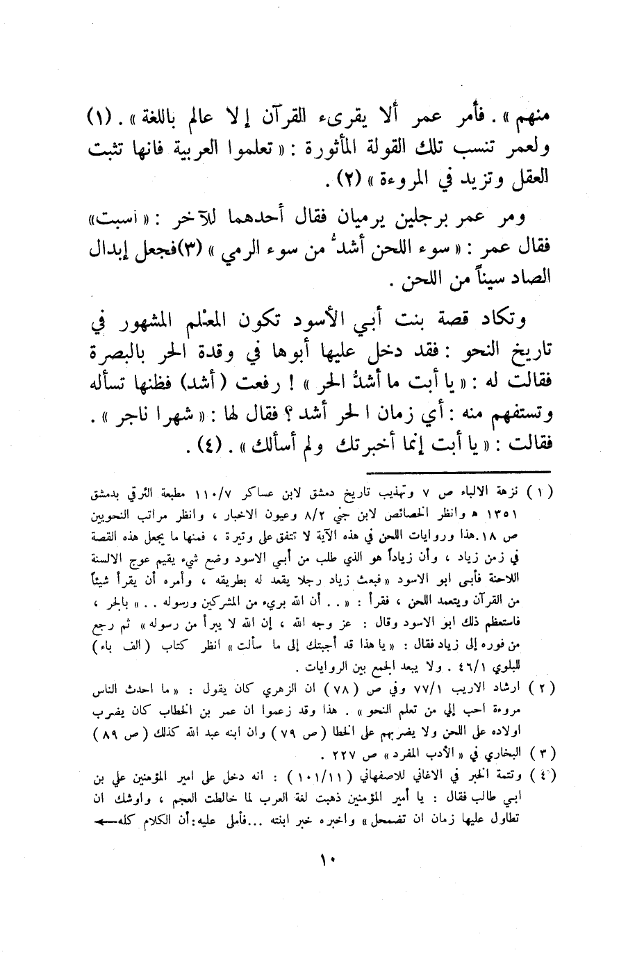 2 إرشاد الأريب 1/ 77 وفي ص"78" أن الزهري كان يقول: "ما أحدث الناس مروءة أحب إلي من تعلم النحو". هذا وقد زعموا أن عمر بن الخطاب كان يضرب أولاده على اللحن ولا يضربهم على الخطأ "ص79" وأن ابنه عبد الله كذلك "ص89".