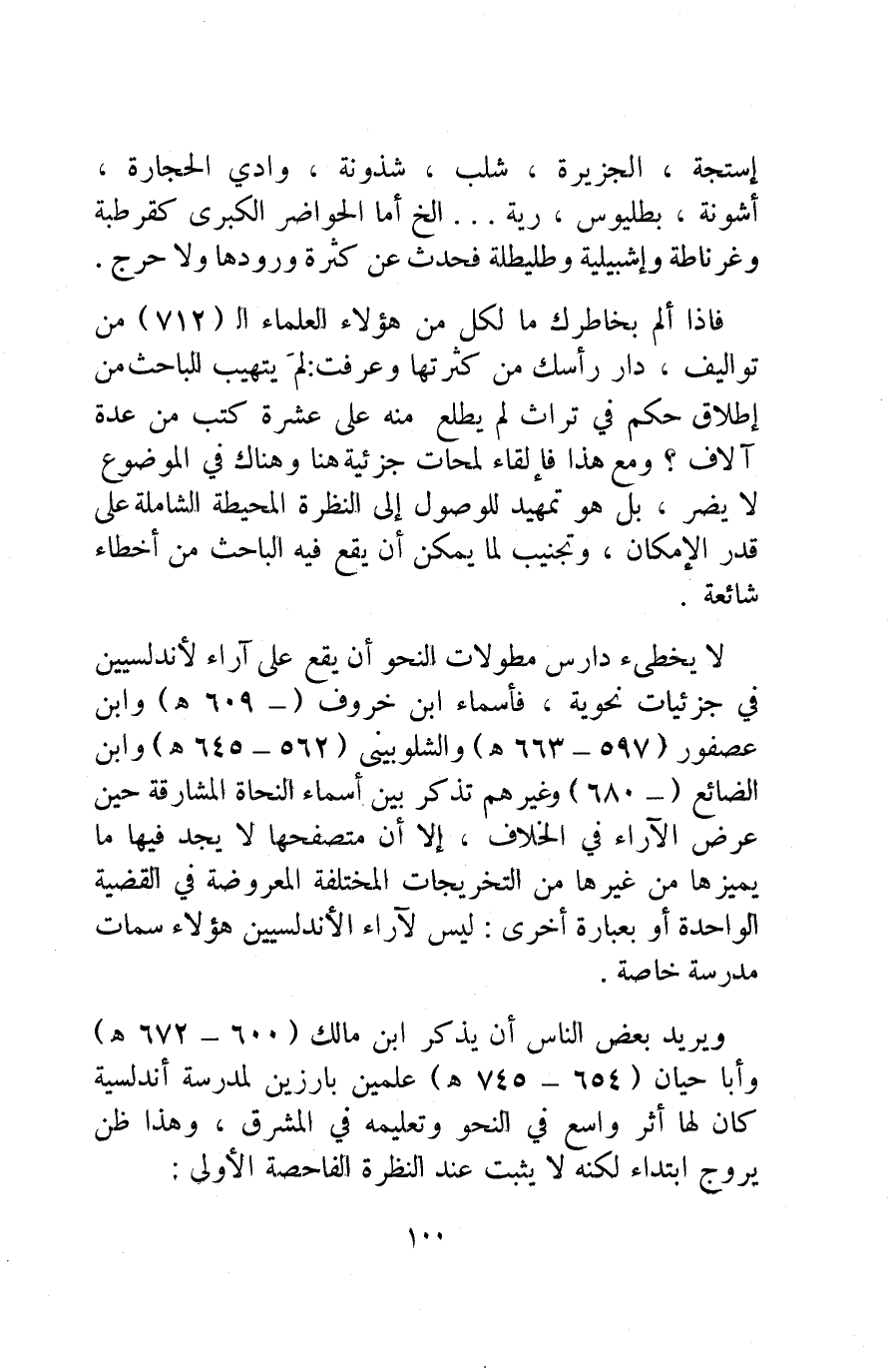 ويريد بعض الناس أن يذكر ابن مالك"600-672هـ" وأبا حيان "654- 745هـ" علمين بارزين لمدرسة أندلسية كان لها أثر واسع في النحو وتعليمه في المشرق، وهذا ظن يروج ابتداء لكنه لا يثبت عند النظرة الفاحصة الأولى: