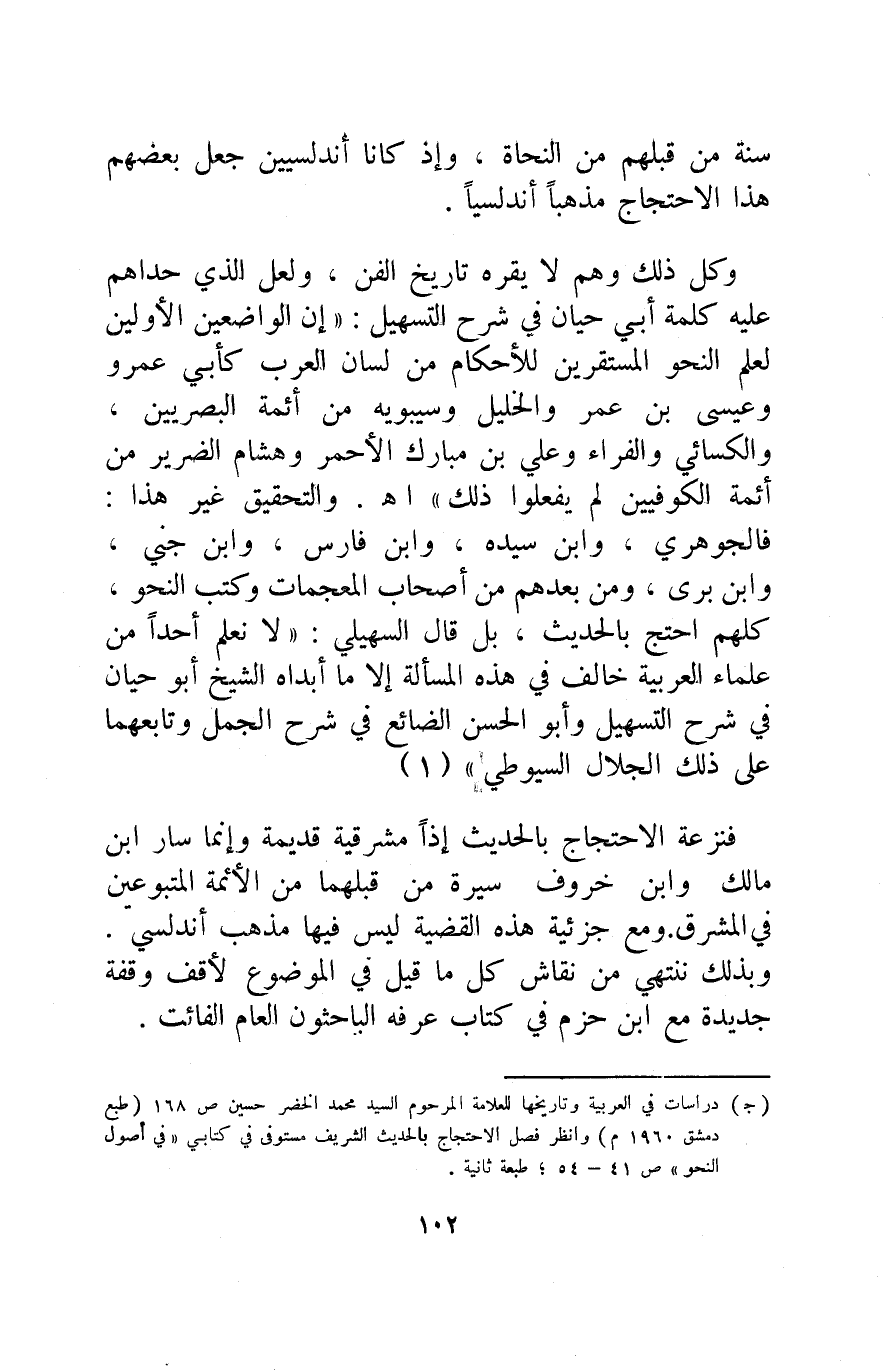 1 دراسات في العربية وتاريخها للعلامة المرحوم السيد محمد الخضر حسين ص168 "طبع دمشق 1960م" وانظر فصل الاحتجاج بالحديث الشريف مستوفى في كتابي "في أصول النحو" ص41-54؛ طبعة ثانية.