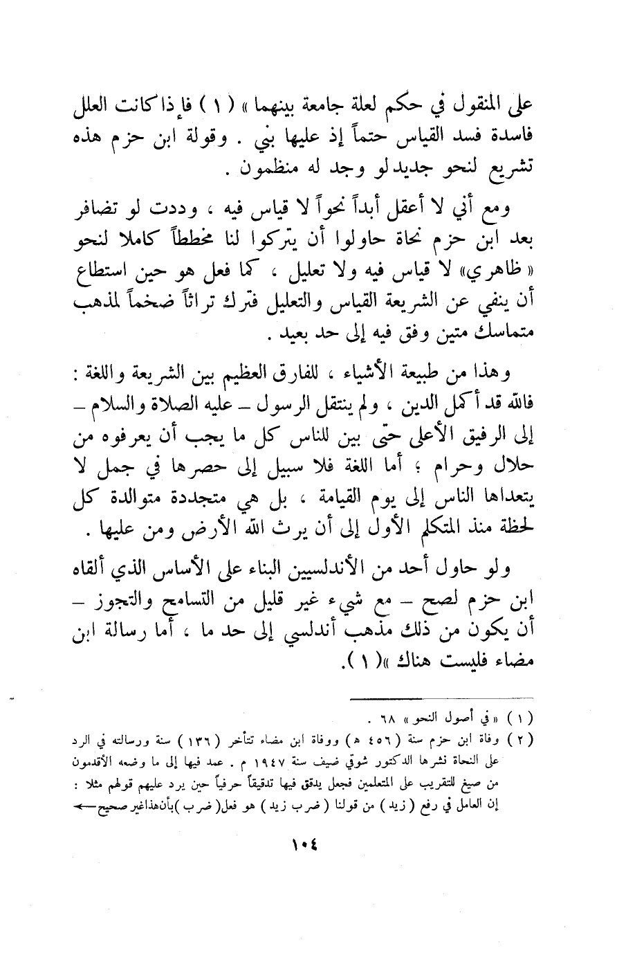 ومع أني لا أعقل أبدا نحوا لا قياس فيه، وددت لو تضافر بعد ابن حزم نحاة حاولوا أن يتركوا لنا مخططا كاملا لنحو "ظاهري" لا قياس فيه ولا تعليل، كما فعل هو حين استطاع أن ينفي عن الشريعة القياس والتعليل, فترك تراثا ضخما لمذهب متماسك متين وفق فيه إلى حد بعيد.