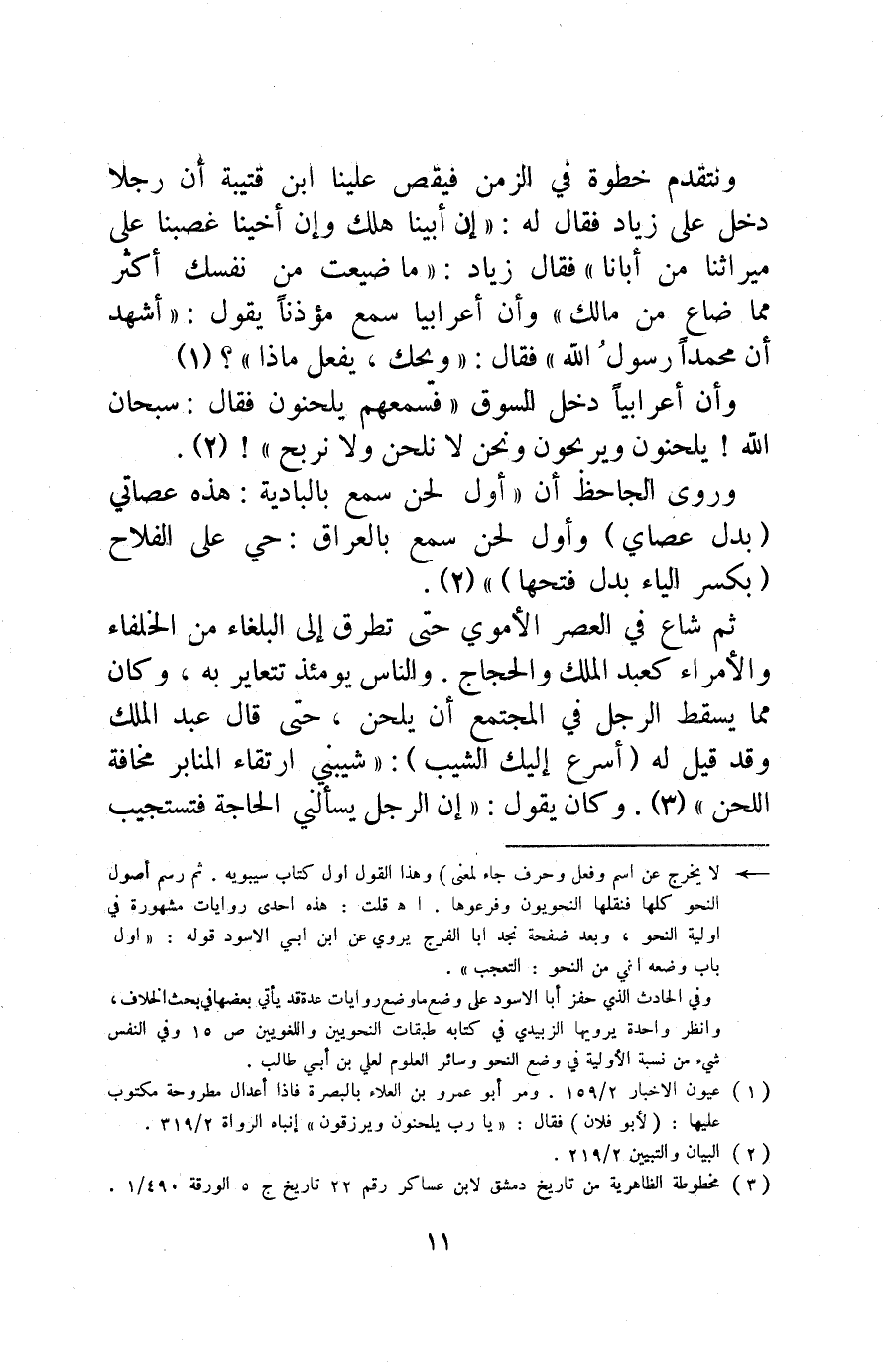 وروى الجاحظ أن "أول لحن سمع بالبادية: هذه عصاتي "بدل عصاي" وأول لحن سمع بالعراق: حيِّ على الفلاح "بكسر الياء بدل فتحها""2.