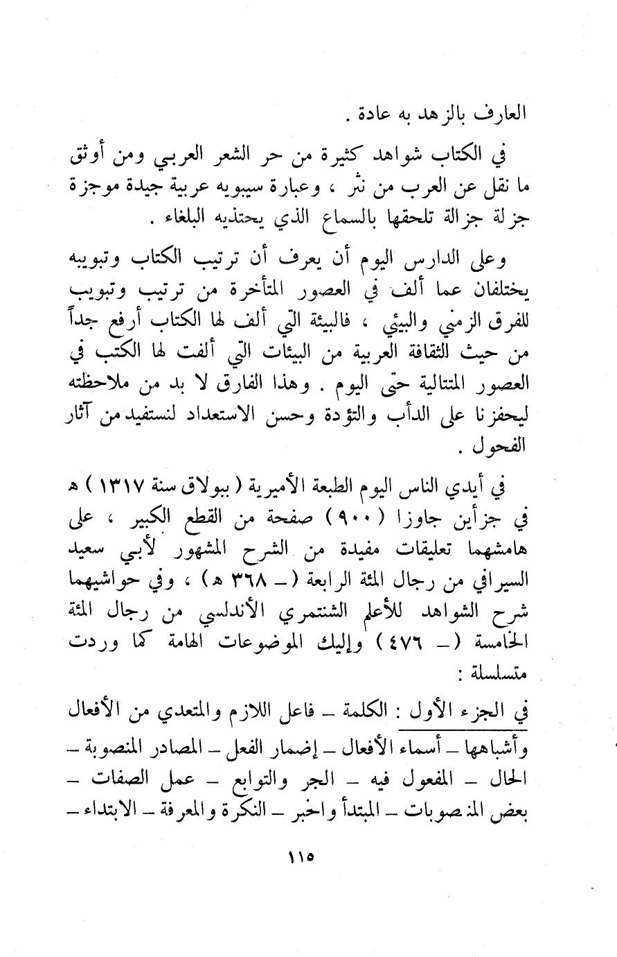 في أيدي الناس اليوم الطبعة الأميرية "ببولاق سنة 1317هـ" في جزأين جاوزا "900" صفحة من القطع الكبير، على هامشهما تعليقات مفيدة من الشرح المشهور لأبي سعيد السيرافي من رجال المائة الرابعة "368هـ"، وفي حواشيهما شرح الشواهد للأعلم الشنتمري الأندلسي من رجال المائة الخامسة "476" وإليك الموضوعات الهامة كما وردت متسلسلة: