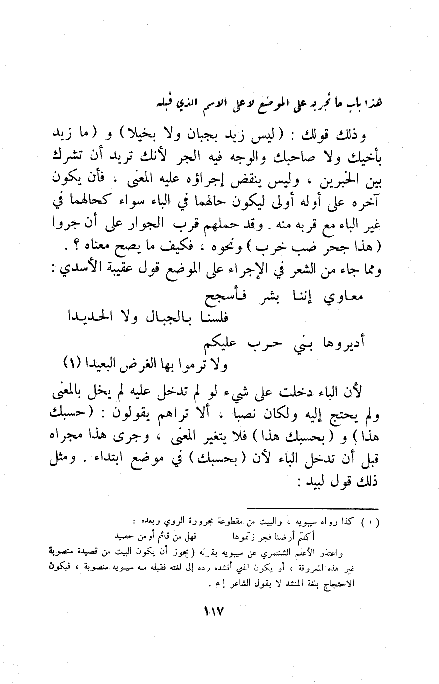 وذلك قولك: "ليس زيد بجبان ولا بخيلا" و"ما زيد بأخيك ولا صاحبك" والوجه فيه الجر؛ لأنك تريد أن تشرك بين الخبرين، وليس ينقض إجراؤه عليه المعنى، فأن يكون آخره على أوله أولى ليكون حالهما في الباء سواء كحالهما في غير الباء مع قربه منه. وقد حملهم قرب الجوار على أن جروا "هذا جحر ضب خرب" ونحوه، فكيف ما يصح معناه؟